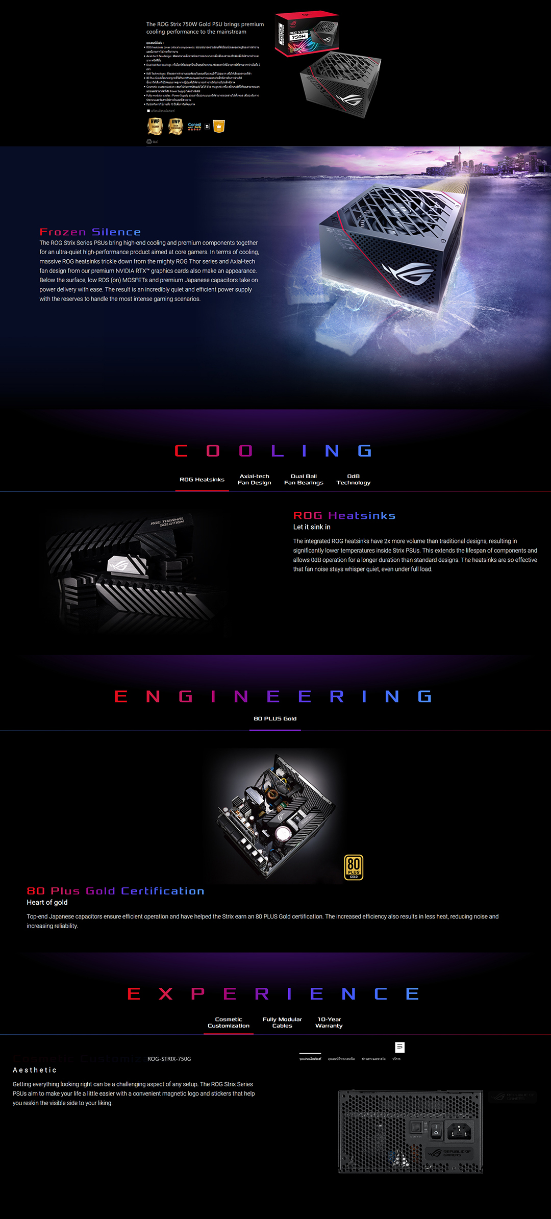 ASUS ROG STRIX 750W โดยเป็น PSU ในซีรี่ย์ ROG ที่มีขนาด 750W พร้อมมาตรฐาน 80Plus Gold และการรับประกันที่ยาวนานถึง 10ปีเต็มกันเลยทีเดียวครับ โดยดีไซน์นั้นออกแบบมาในโทนสีดำสนิทครับสามารถตกแต่งติดสติ๊กเกอร์หรือแผ่นแม่เหล็กเพิ่มลวดลายให้สวยงามตามใจชอบได้อีกด้วย ในส่วนของฟีเจอร์การทำงานนั้นก็จัดเต็มด้วยวัสดุคุณภาพเยี่ยมไม่ว่าจะเป็นชุด low RDS (on) MOSFETs และคาปาซิเตอร์ Premium Japanese capacitors จากญี่ปุ่นกันเลยทีเดียวครับ ในเรื่องของระบบระบายความร้อนนั้นก็มีชุดฮีตซิงค์ ROG heatsinks cover critical components กับระบบระบายความร้อนที่ดีเยี่ยมช่วยลดอุณหภูมิของการทำงานและมีอายุการใช้งานที่ยาวนาน ส่วนชุดพัดลมนั้นเป็นแบบ Axial-tech fan design และระบบ 0dB Technology ที่ช่วยลดเสียงรบกวนสามารถเปิด-ปิดได้ตามสะดวกครับ ซึ่งตัว ASUS ROG STRIX 750W นั้นเป็นแบบ Fully modular ที่ถอดสายได้ทั้งหมดครับเพื่อรองรับการประกอบและจัดสายไฟภายในเคสให้ง่ายและสวยงามเพื่อนักม๊อดโดยเฉพาะอีกด้วย ส่วนจะมีประสิทธิภาพการทำงานจะเป็นเช่นไรนั้นเดี๋ยวเราไปชมในรีวิวกันได้เลยครับ