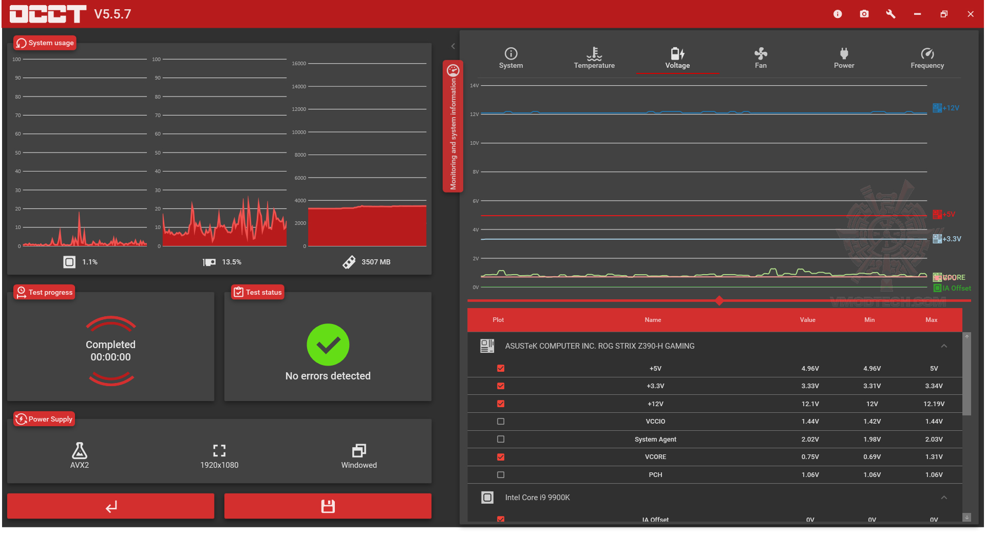 เทสกันเต็มระบบการทำงานเต็มโหลด PSU ทั้งระบบครับ จัดกันยาวๆฟูลดหลดแบบ 15นาทีเต็มๆ ภาคจายไฟ +5V ทำได้นิ่งดีครับอยู่ที่ 0.496V ซึ่งก็ไม่ได้ขยับไปไหนเลย ส่วนภาคจ่ายไฟ 3.3V อยู่ที่ 3.328V ครับ เมื่อเจอโหลดหนักๆจะอยู่ที่ 3.344V ซึ่งแทบไม่ขยับเลยถือว่าทำได้นิ่งเยี่ยมมากๆเลยทีเดียวครับ ส่วนย่าน +12V นั้นอยู่ที่ 12.1V ครับ ใช้งานเต็มที่ฟลูโหลดอยู่ที่ 12.19V เรียกได้ว่านิ่งเยี่ยมมากๆครับค่าเบี่ยงเบนน้อยมากๆครับ ภาพรวมนั้นถือว่าทำได้เยี่ยมมากๆครับกับค่า efficiency ที่ดีเยี่ยมกันเลยทีเดียว