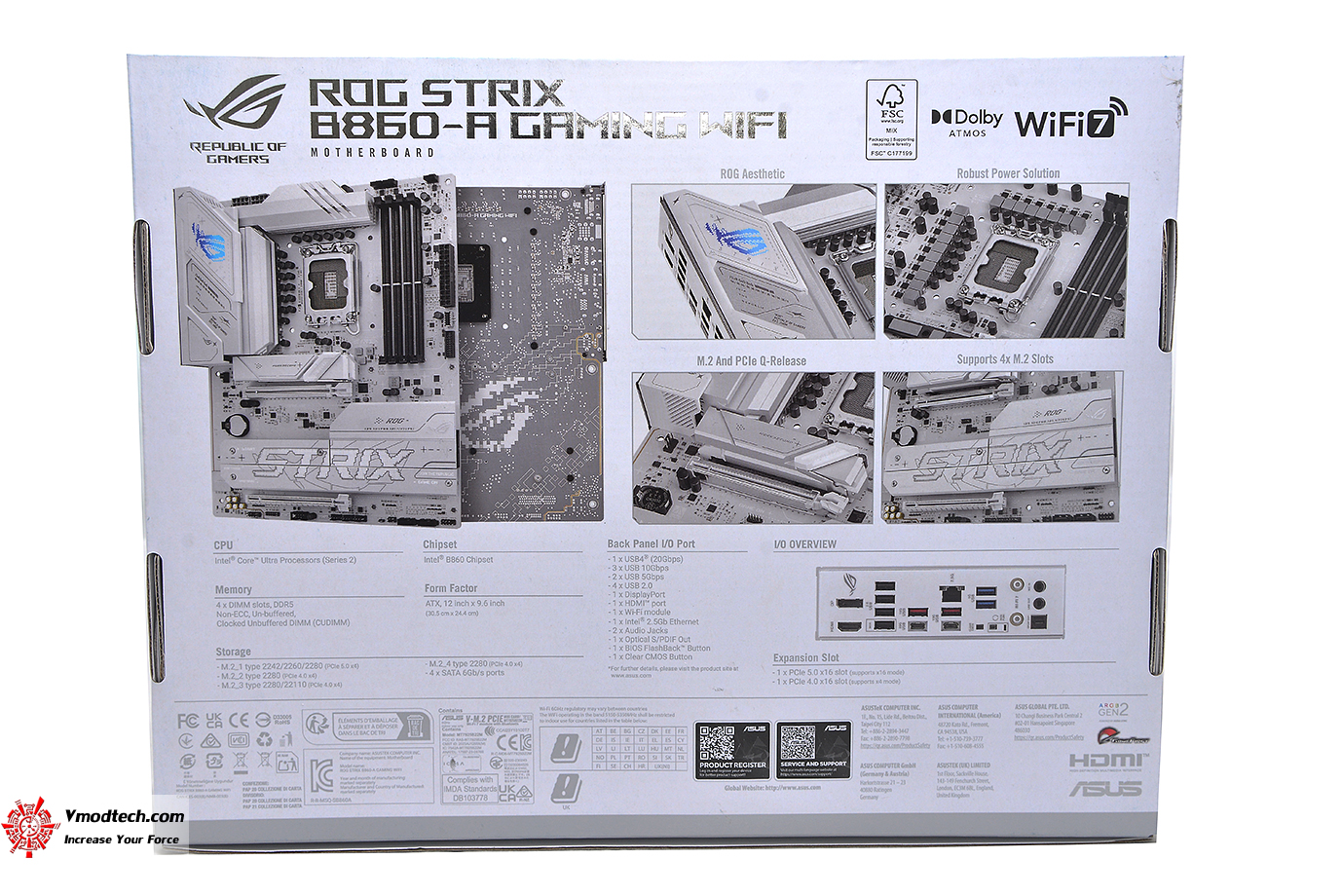 ตัวกล่องสีขาวสวยงามโดดเด่นตามสไตล์ ROG STRIX บอกชื่อรุ่น ASUS ROG STRIX B860-A GAMING WIFI พร้อมฟีเจอร์การทำงานเอาไว้ชัดเจนครับ