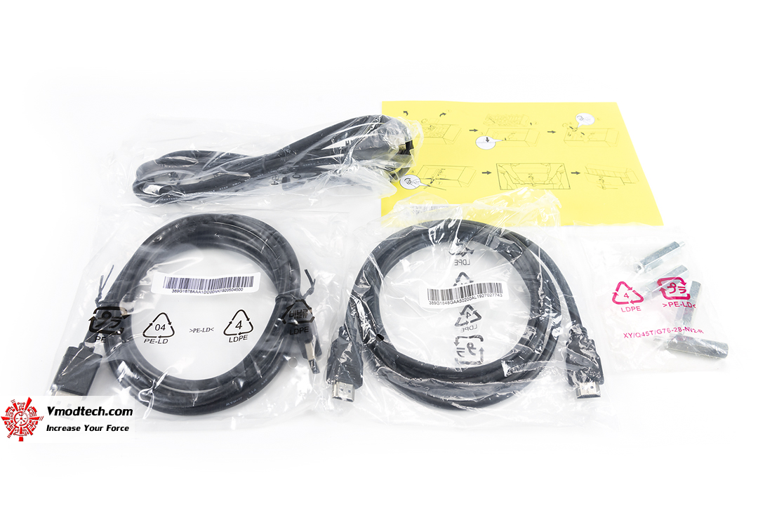 อุปกรณ์จำพวกสายไฟ สายสัญญาณ คู่มือแผ่นพับและแท่นรองตัวจอที่แยกมาในกล่องบรรจุ