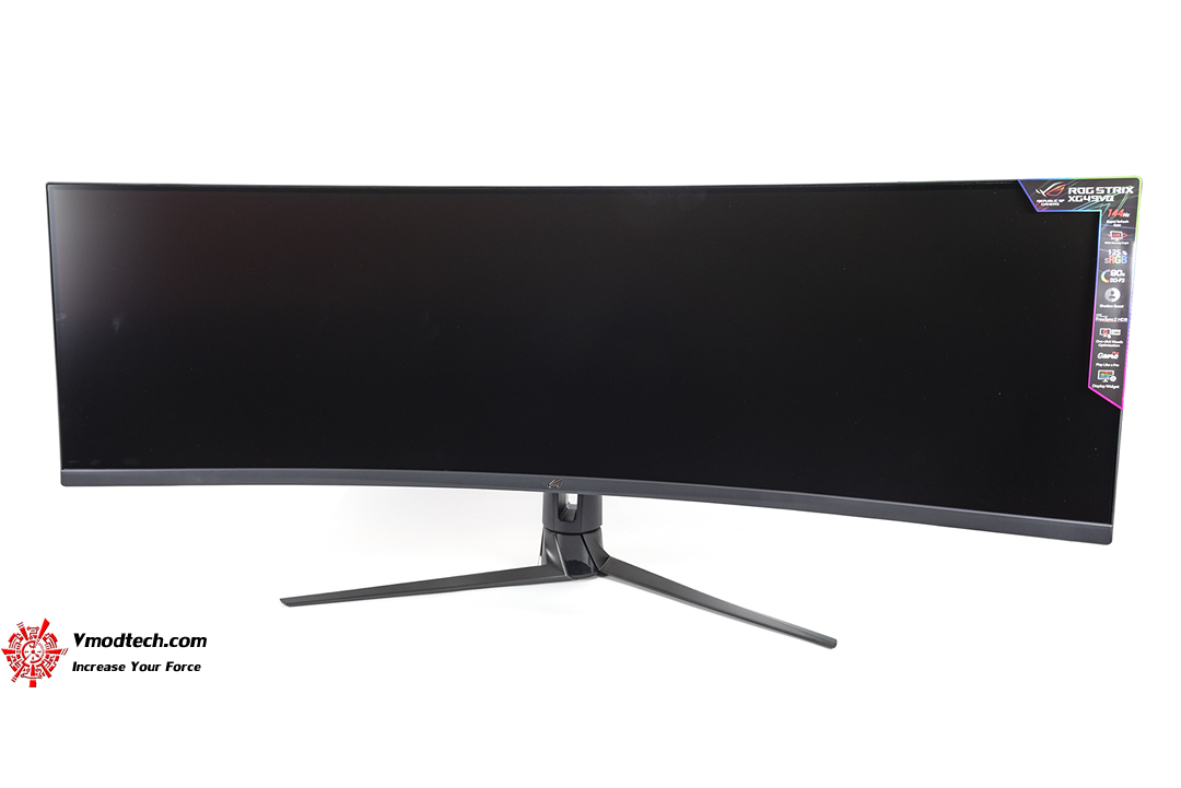 ASUS ROG Strix XG49VQ มีความละเอียด 3840 x 1080 บนอัตราส่วน 32:9 ขนาด 49 นิ้ว บนพาแนลแบบ VA ที่มีจุดเด่นที่สามารถให้รีเฟรชเรทสูง 144 Hz ที่ตรงกลางจอใต้โลโก้ ROG นั้นจะเป็นปุ่มสำหรับเข้าไปปรับแต่งค่าต่างๆของจอ
