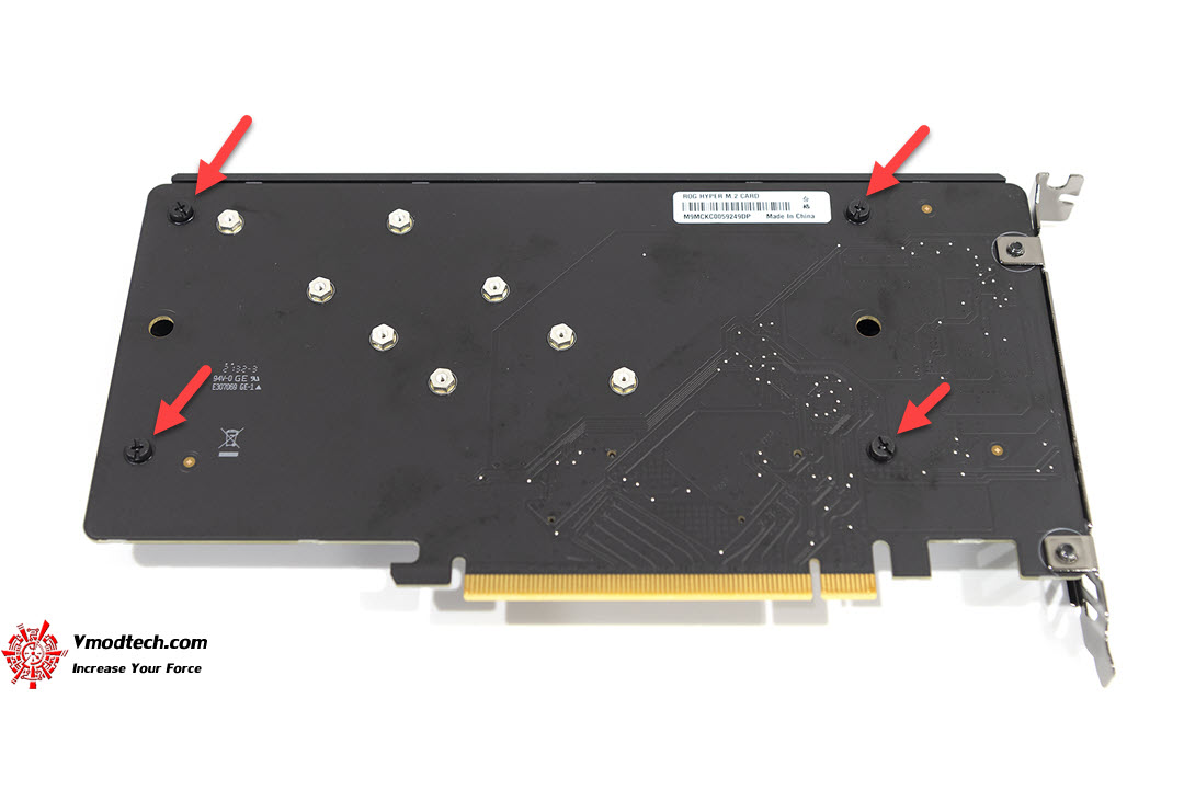 ในการถอดฮีทซิ้งของ ROG HYPER M.2 นั้นต้องถอดสกรูสี่ตัวที่ด้านหลังครับ