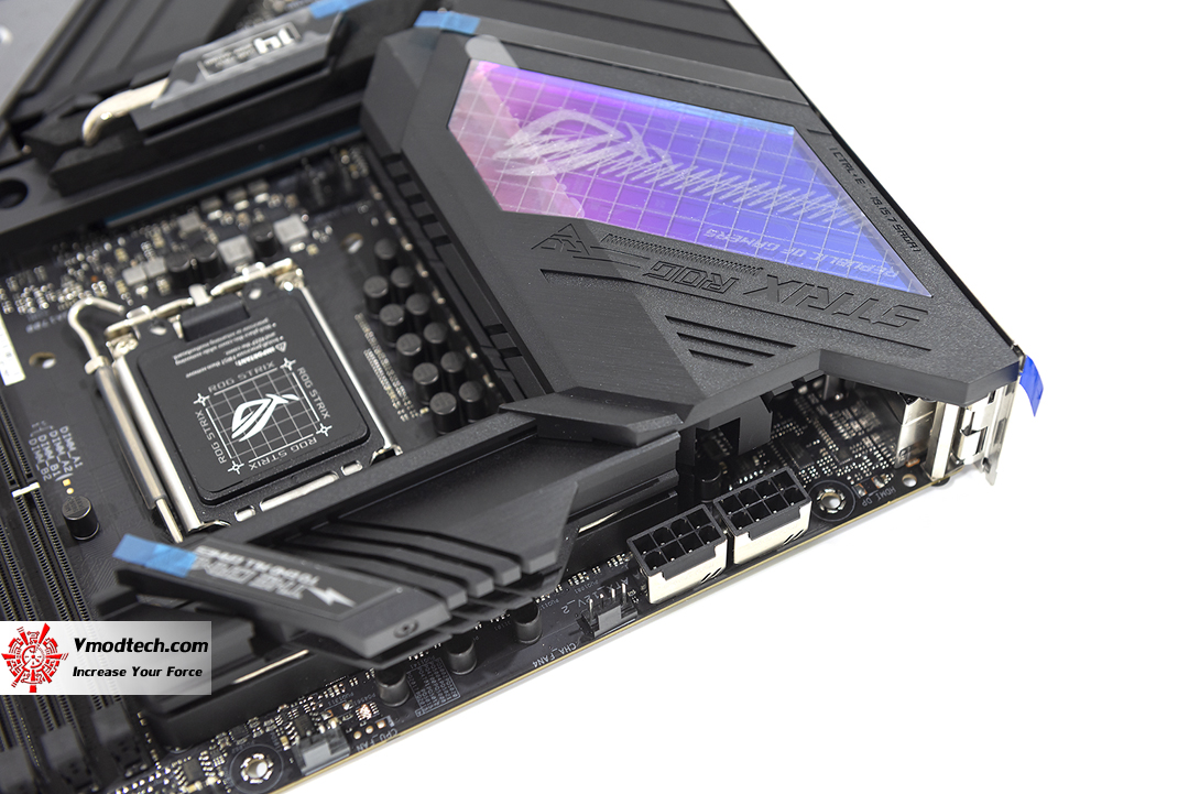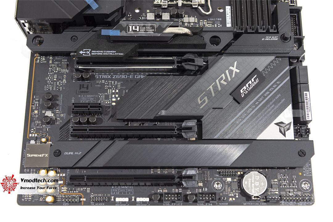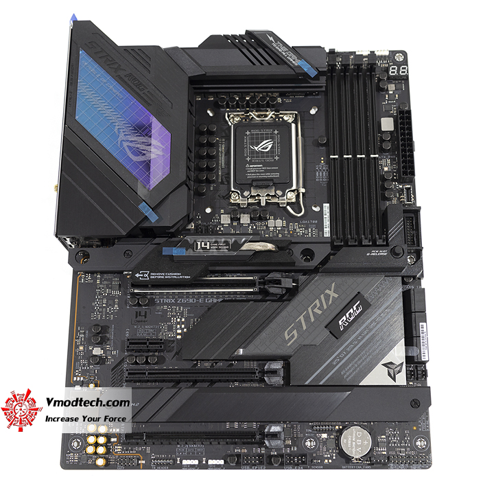 หน้าตามุมตรงของมาเธอร์บอร์ด ROG STRIX Z690-E GAMING WIFI ซึ่งหากมองในจุดนี้จะเห็นถึงความสวยงามแบบดุดันไม่แพ้บอร์ดรุ่นท๊อป Maximus เลยนะ