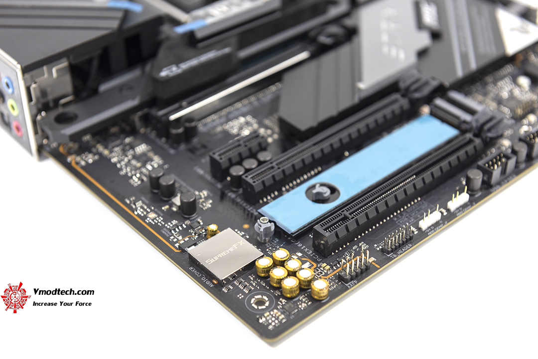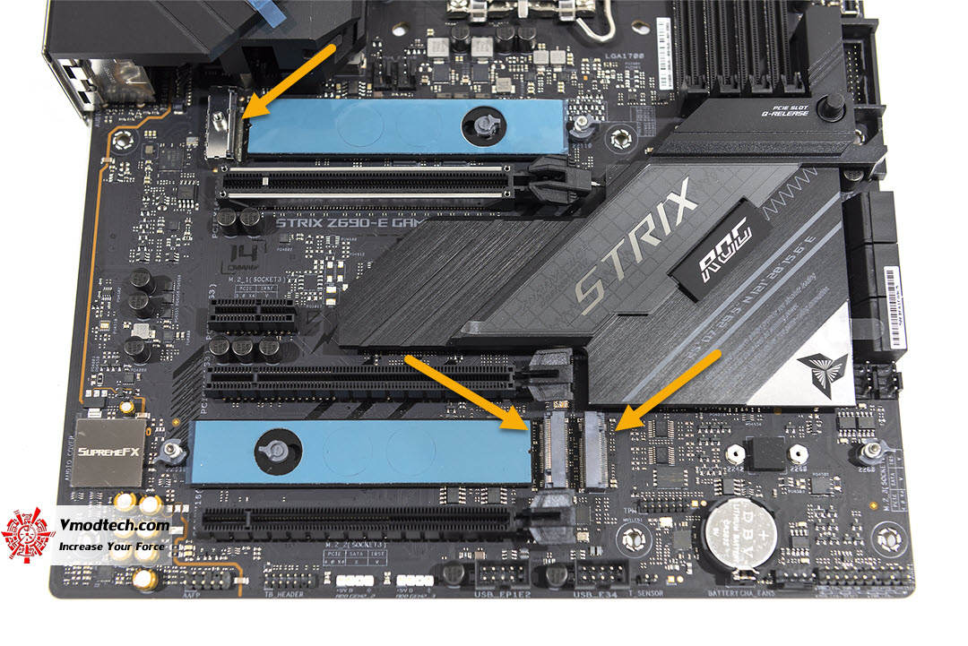บริเวณสล๊อด PCI Express ซึ่งจะมีพอร์ด PCIe x16 gen 4 สองพอร์ทบนล่าง และ x16 gen 3 ที่ช่องกลาง และอีกหนึ่งช่องจะเป็น X1 gen 3 หนึ่งช่อง ส่วนที่เครื่องหมายลูกศรสีเหลือชี้นั้นจะเป็นพอร์ท M.2 สามช่อง