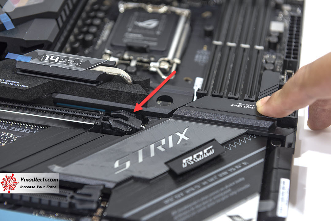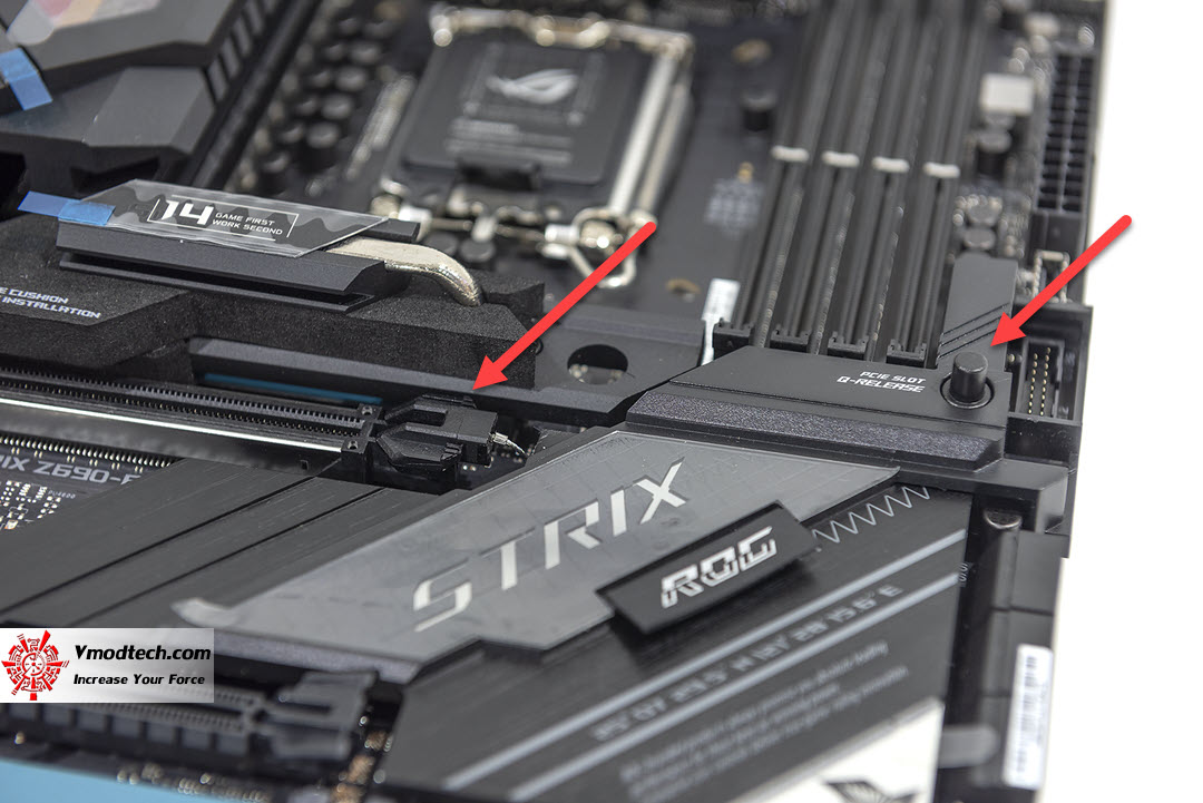 ตรงนี้จะเป็นของเล่นเล็กน้อยสำหรับการปลดการ์ดจอจากช่องหลักออกครับ คือเมื่อเสียบการ์ใช้งานแล้ว หากต้องการจะปลดออกปกติเราต้องเอาไขควงหรือวัสดุแข็งกด แต่ตอนนี้เราสามารถเอานิ้วกดเพื่อปลดการ์ดได้เลย สะดวกมาก