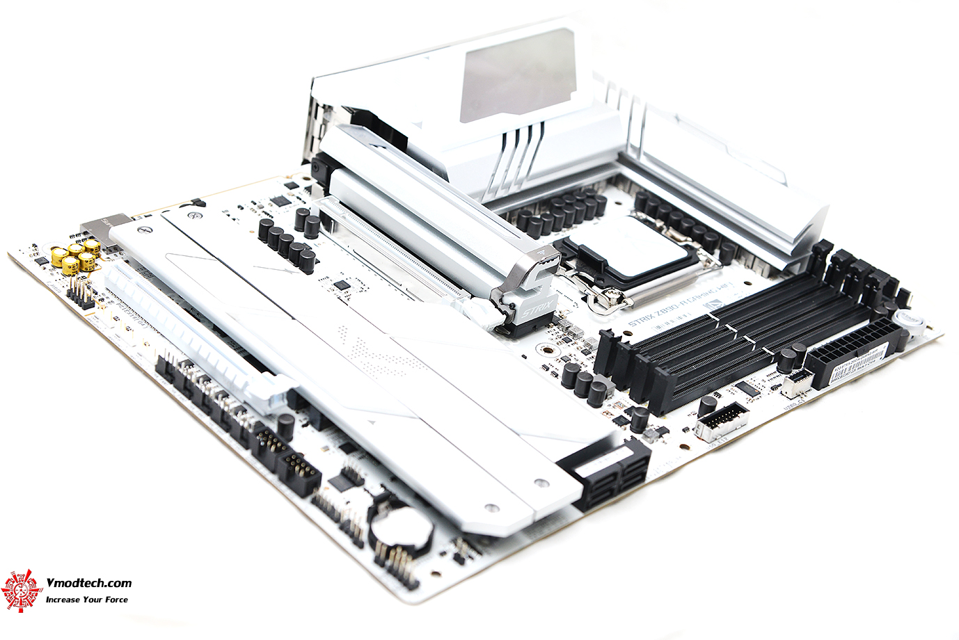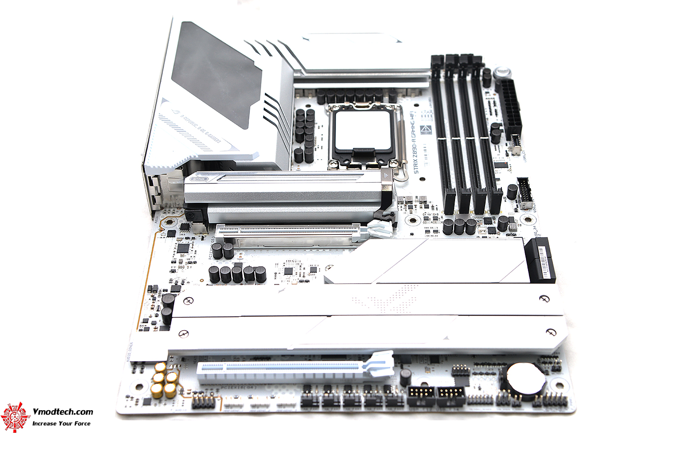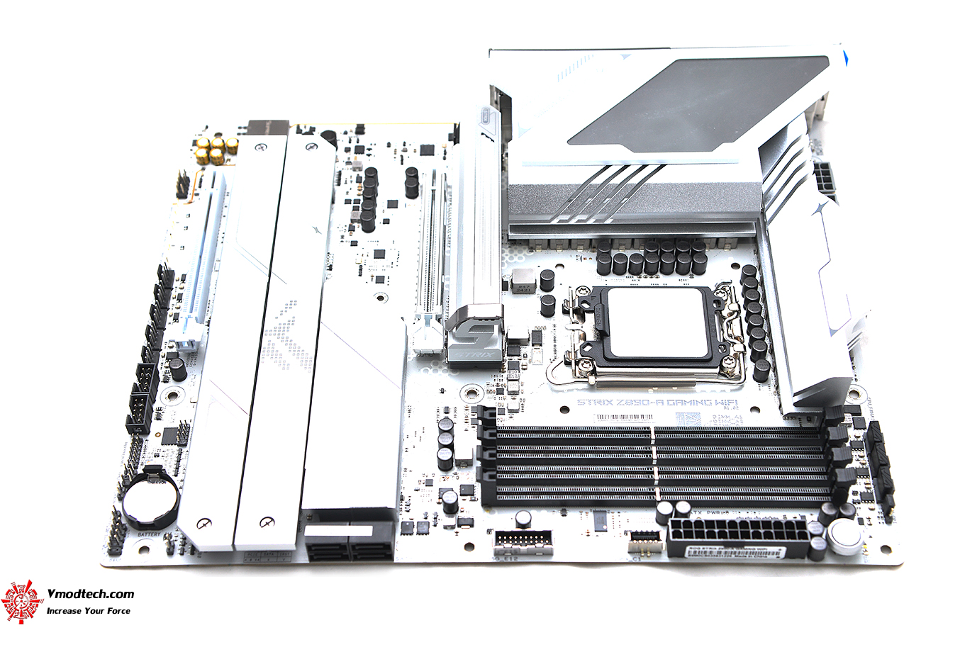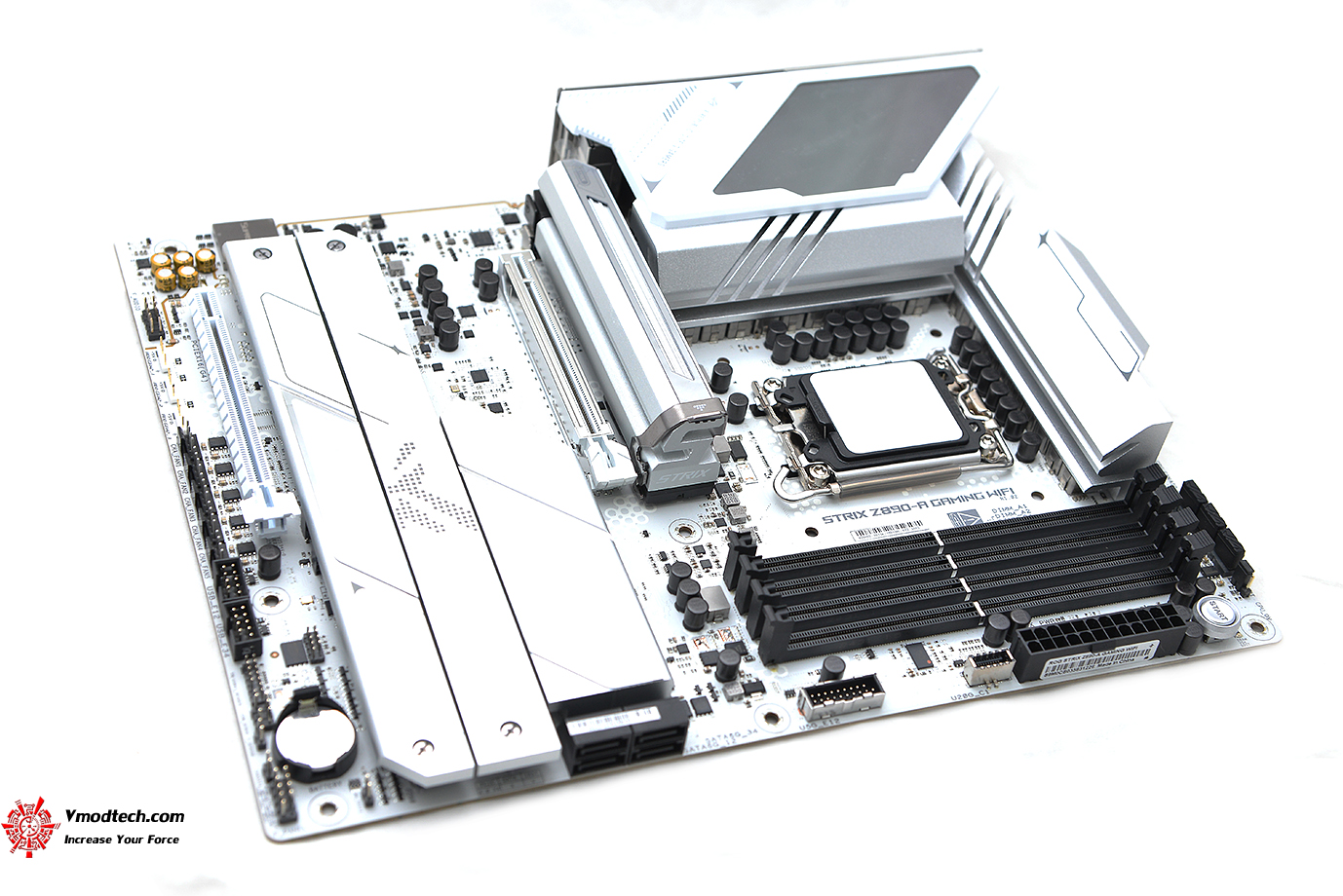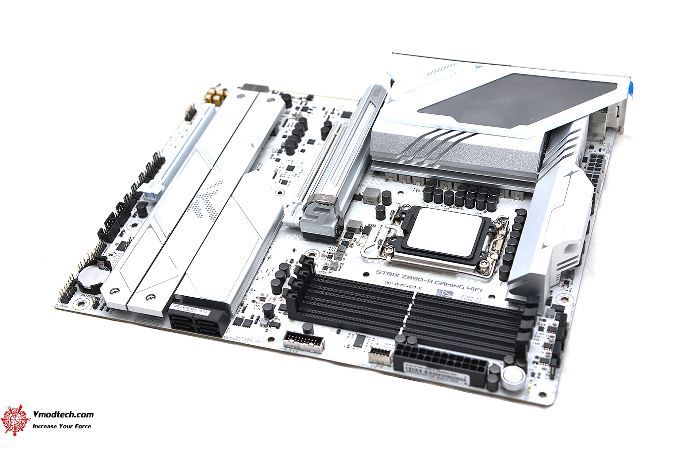 ตัวเมนบอร์ด ASUS ROG STRIX Z890-A GAMING WIFI สีขาวล้วนสลับด้วยฮีตซิงค์สีเงินเทาสวยงามโดดเด่นตามสไตล์ ROG ซีรี่ย์แม้จะเป็นเมนบอร์ดตระกูล ROG STRIX แต่ความสวยงามนี่จัดเต็มครับเลยครับ