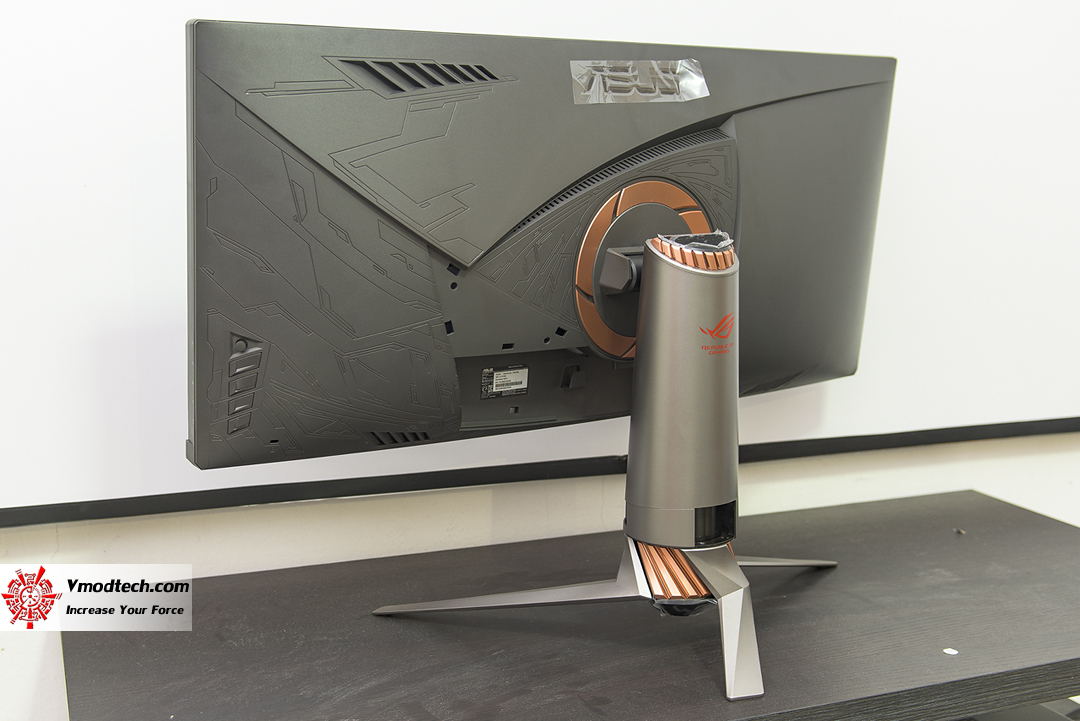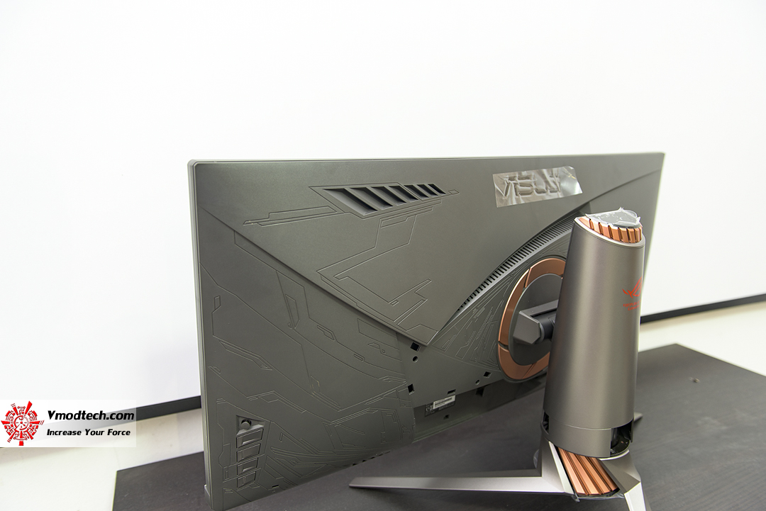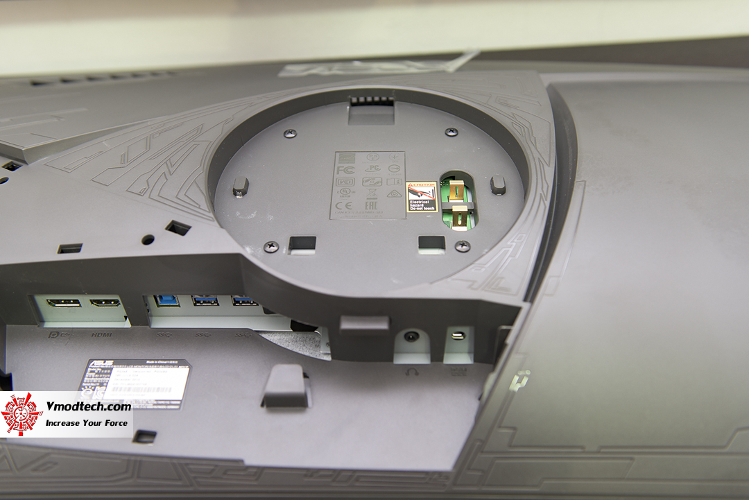 บริเวณด้านหลังของจอก่อนที่จะติดตั้งขาตั้งเข้าไปครับ การประกอบนั้นไม่ยากครับ จะเห็นขั่วทองเหลืองอยู่สองอันนั้นจะเป็นจุดที่จะจ่ายไฟไปยังฐานที่จะสามารถเปล่งแสงเป็นสัญญลักษณ์ ROG ให้สะท้อนบนพื้นได้