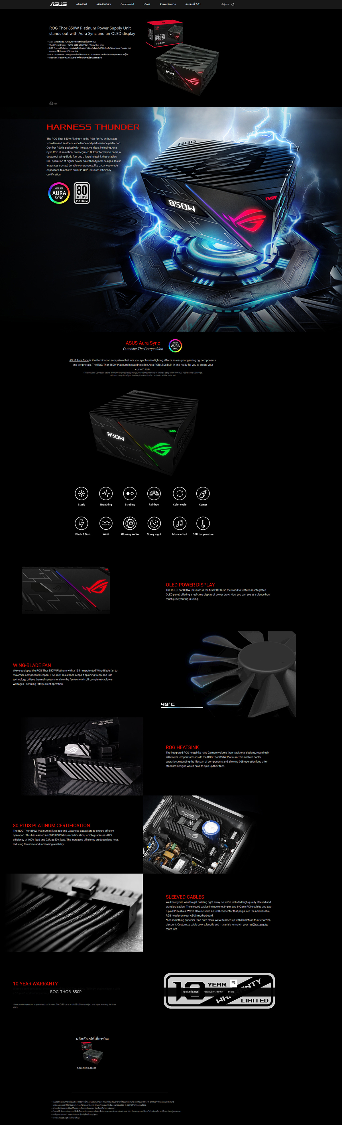 ROG THOR 850W PLATINUM โดยเป็น PSU ขนาดความจุ 850W แบบ Full Modular ที่มีมาตรฐานในระดับ 80PLUS PLATINUM กันเลยครับพร้อมค่า 89% efficiency ที่สูงเลยทีเดียวครับการันตีว่าจ่ายไฟนิ่งเยี่ยมกันเลยทีเดียว ในส่วนของวัสดุต่างๆภายในตัว PSU นั้นก็ประกอบด้วยอุปกรณ์คุณภาพเยี่ยมไม่ว่าจะเป็นชุดคาปาซิเตอร์จากญี่ปุ่น Japanese capacitors ในระดับท๊อปสุงสุดที่นำมาใช้งานรวมไปถึงบรรดาฮีตซิงค์ ROG ที่ทำหน้าที่ระบายความร้อนด้านในตัวอุปกรณ์ PSU ด้วยดีไซน์ที่สวยงามมีไฟแสดงผล ASUS Aura Sync RGB ที่ด้านข้างสามารถซิงค์การทำงานกับบรรดาเมนบอร์ดได้อย่างสมบรูณแบบพร้อมทั้งหน้าจอ OLED ที่แสดงผลแรงดันไฟอีกด้วย ในเรื่องของความเงียบ ASUS ROG THOR 850W PLATINUM ได้ออกแบบชุดพัดลมแบบ WING-BLADE FAN ที่เน้นทั้งความเงียบและประสิทธิภาพควบคู่กันได้อย่างลงตัวและมีระบบ Slient โหมดเงียบในการใช้งานให้อีกด้วย ส่วนจะมีประสิทธิภาพการทำงานจะเป็นเช่นไรนั้นเดี๋ยวเราไปชมในรีวิวกันได้เลยครับ