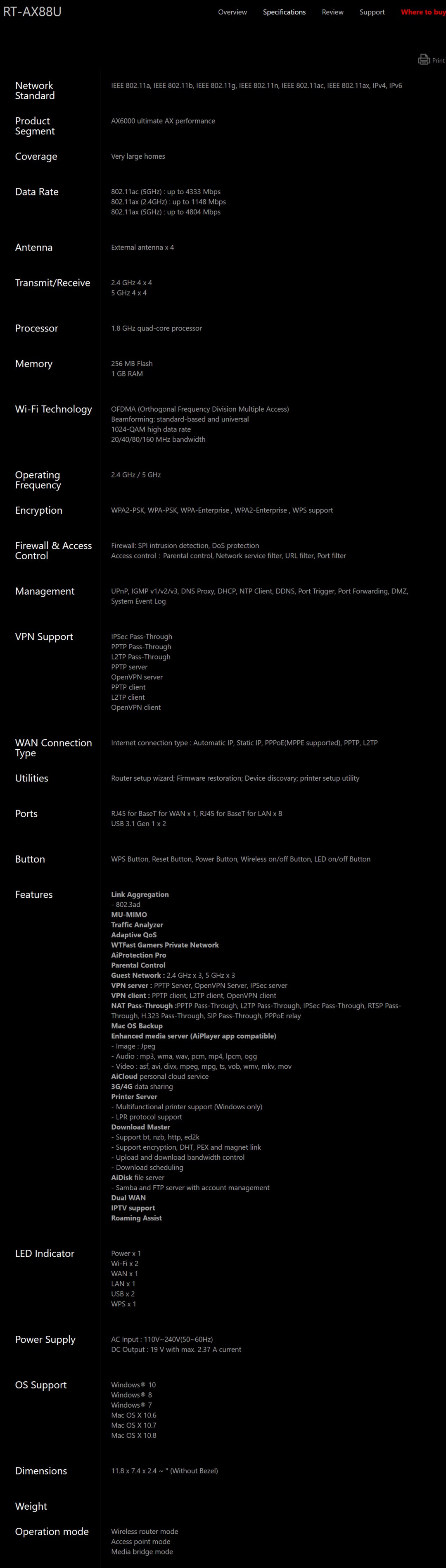 สวัสดีครับ วันนี้มี Router รุ่นใหญ่ รุ่นใหม่ล่าสุดที่มีประสิทธิภาพสูงจากแบรนด์ยอดนิยมที่ผลิตอุปกรณ์ประเภทเนตเวอร์คออกมามากมายและครอบคลุมทุกความต้องการ ทุกช่วงราคามารีวิวให้ได้ชมกัน ASUS RT-AX88U นั้นเป็น Wireless Dual Band 802.11ax Router ที่รองรับการเชื่อมต่อแบบไร้สายได้สองย่านความถี่ 2.4 และ 5 GHz บนคลาส AX6000 Mbps แบ่งเป็น 2.4GHz ax 1,148 Mbps, 5.0GHz ac ที่ 4,333 Mbps และบนย่าน 5.0GHz ax ที่ความเร็ว 4,804 Mpbs ซึ่ง RT-AX88U นั้นเป็นเราเตอร์รุ่นแรกจากแบรนด์ ASUS ที่ทำงานบนคลาส 802.11ax ในตัวเราเตอร์นั้นอัดแน่นไปด้วยเทคโนโลยี MU-MIMO (Multi-User Multiple Input Multiple Output) ทำให้สามารถใช้งานอุปกรณ์ที่เชื่อมต่อพร้อมๆกันได้หลายๆอุปกรณ์ภายในพื้นที่ขนาดใหญ่ และด้วยเทคโนโลยี beamforming ที่สามารถช่วยกระจายสัญญาณได้ดีกว่า ครอบคลุมมากกว่าด้วย ด้านการแชร์ข้อมูลนั้นก็มีพอร์ท USB 3.1 gen 1 จำนวนสองพอร์ทเพื่อตอบสนองการเชื่อมต่อกับอุปกรณ์จัดเก็บประเภท USB Flash Drive หรือ Harddrive ครับ และวันนี้การทำงานของ RT-AX88U นั้นอาจจะยังไม่สมบูรณ์แบบบนคลาส ax เท่าไหร่นัก ดังนั้นเราจะนำเอา WiFi adapter ของ ASUS เอง รุ่น PCE-AC58BT มาทำการทดสอบร่วมกันด้วย