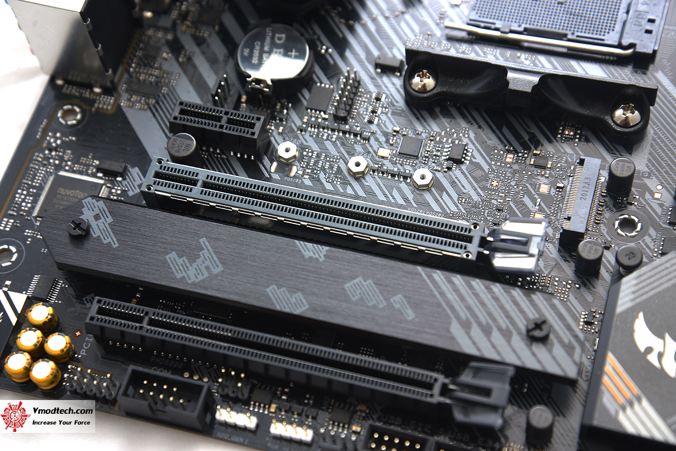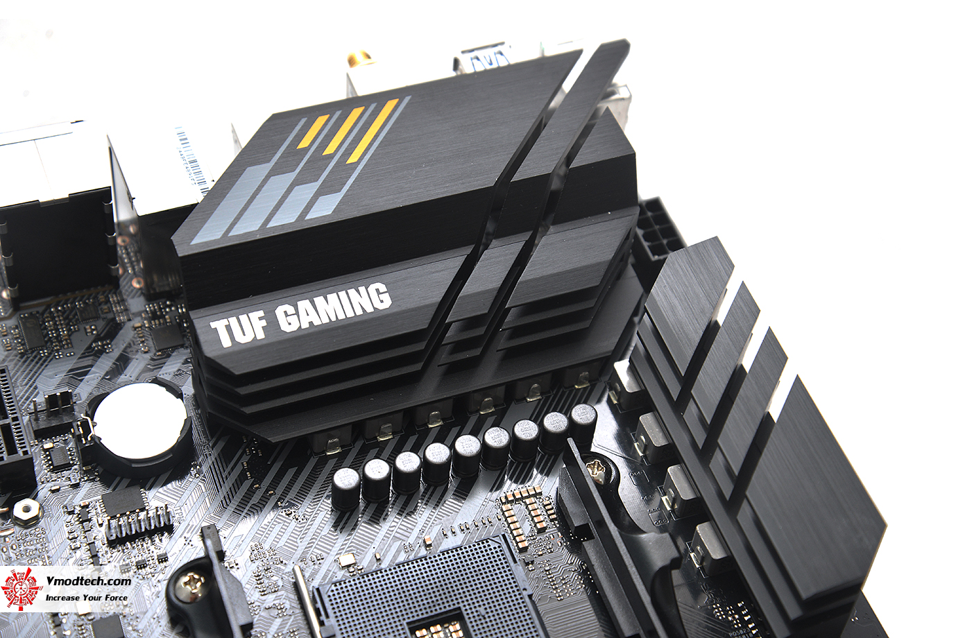 ฮีตซิงค์ภาคจ่ายไฟด้านบนมีโลโก้ TUF GAMING และลวดลายสีขาวสลับเหลืองดูสวยงามครับ ภาคจ่ายไฟเป็นแบบ 8+2 DrMOS power stages เฟสพร้อมด้วยชุด TUF CHOKES & TUF CAPACITORS แบบจัดเต็มรองรับการโอเวอร์คล๊อกเลยทีเดียว