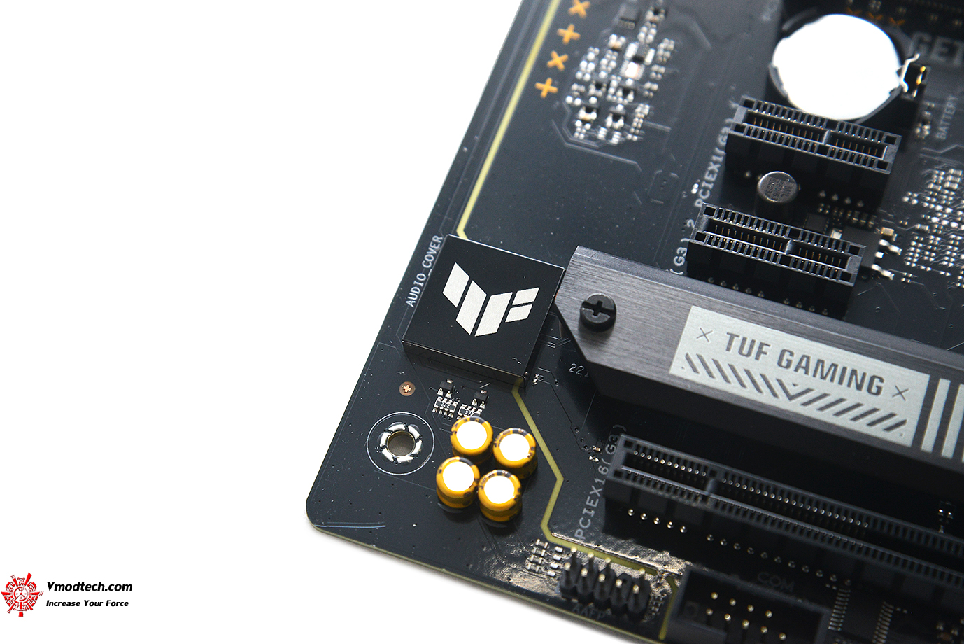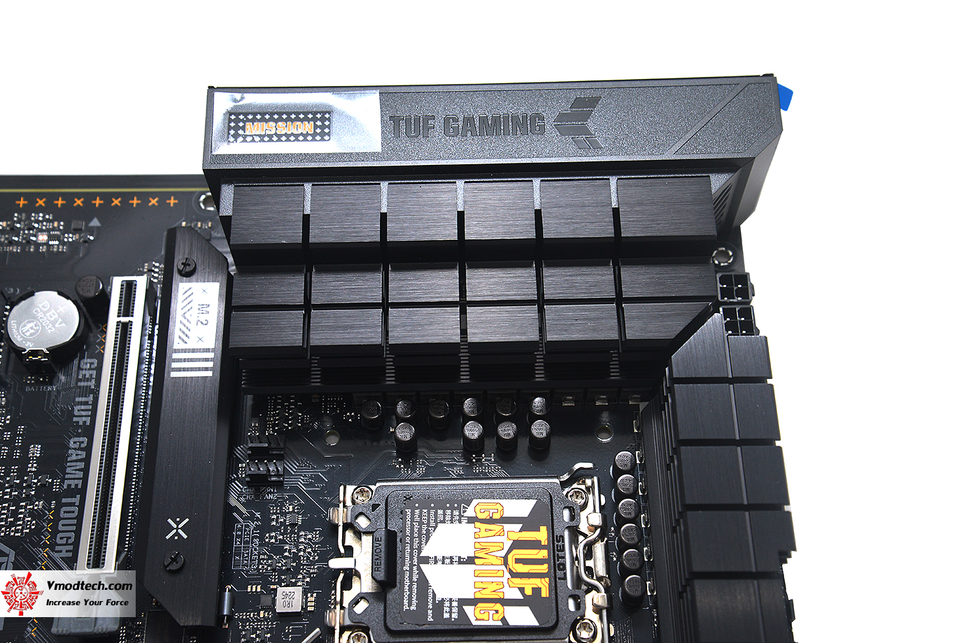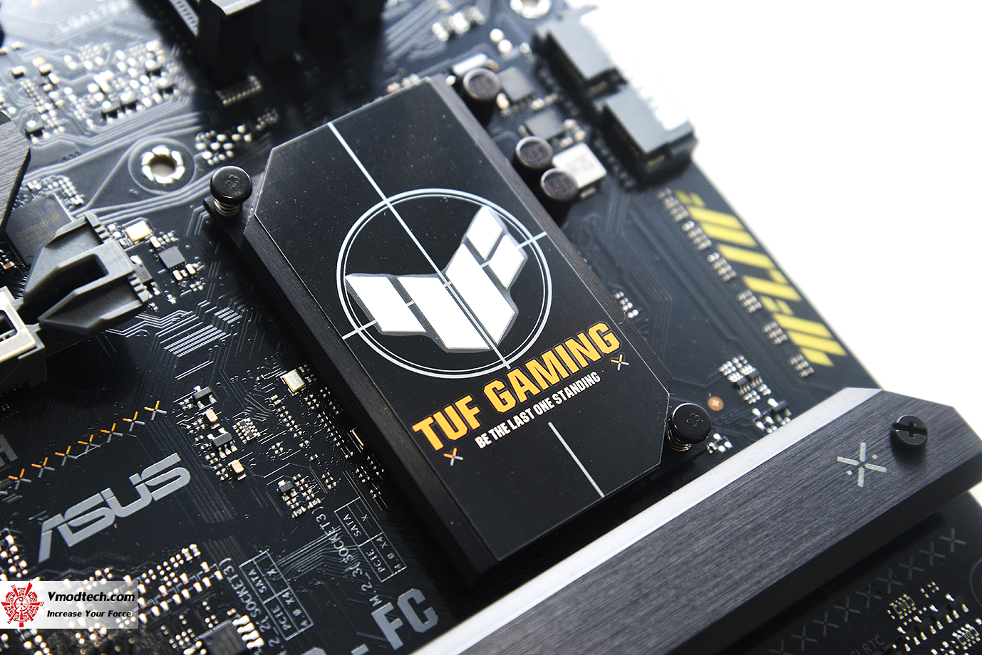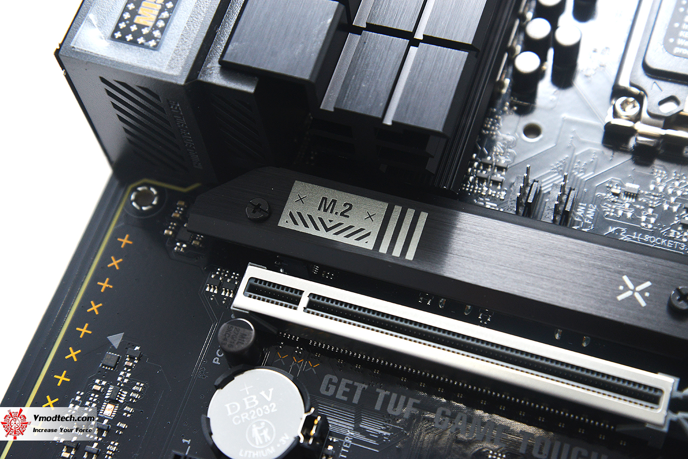 ที่ช่อง M.2 ด้านล่างมาพร้อม heatsink แบบยาวพร้อมระบายความร้อนในการใช้งานให้เลยครับพร้อมข้อความ TUF GAMING ดูโดดเด่นมากครับ