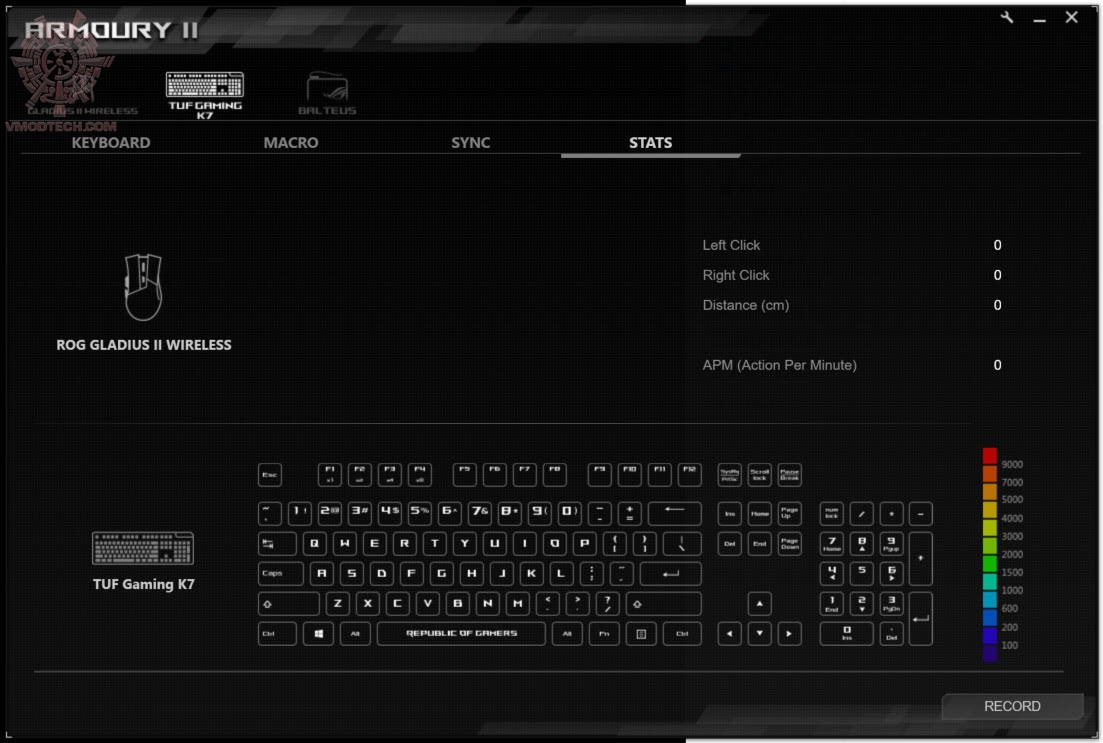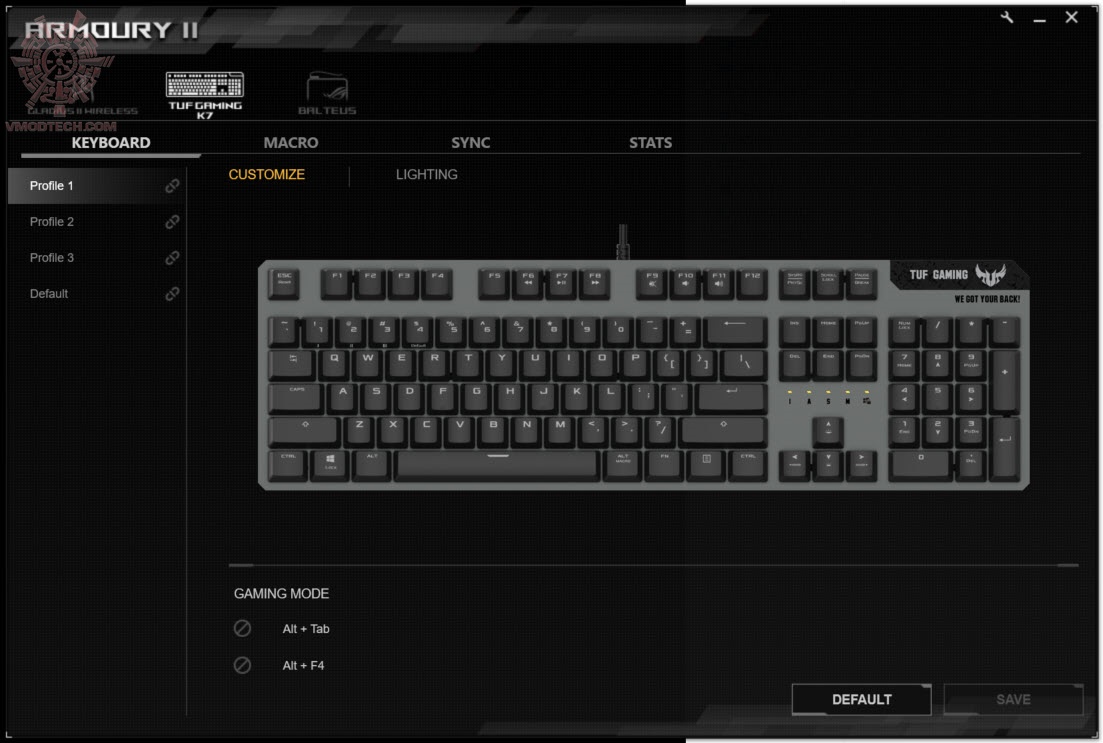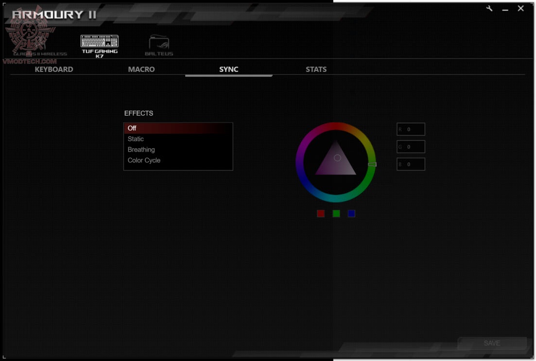 เราสามารถปรับแต่งแสงสีให้กับ TUF Gaming K7 ของคุณได้อย่างอิสระด้วย ASUS Aura Sync RGB lighting ที่ไม่มีที่สิ้นสุดของสีและเอฟเฟกต์แสงแบบไดนามิกต่างๆ โดยสามารถซิงค์กับอุปกรณ์อื่นๆ ที่รองรับ Aura sync ได้โดยทำผ่าน ROG Armoury II เป็นซอฟต์แวร์ที่ออกแบบมาสำหรับการตั้งค่าเพื่อควบคุมการใช้งานของอุปกรณ์ Gaming Gear จาก ASUS ซึ่งสามารถตั้งค่าการใช้งานต่างๆ ไม่ว่าจะเป็น การเซ็ตมาโครคีย์, ควบคุมแสงไฟ RGB เพื่อให้เหมาะสมกับรูปแบบการใช้งานและการเล่นเกมของคุณ