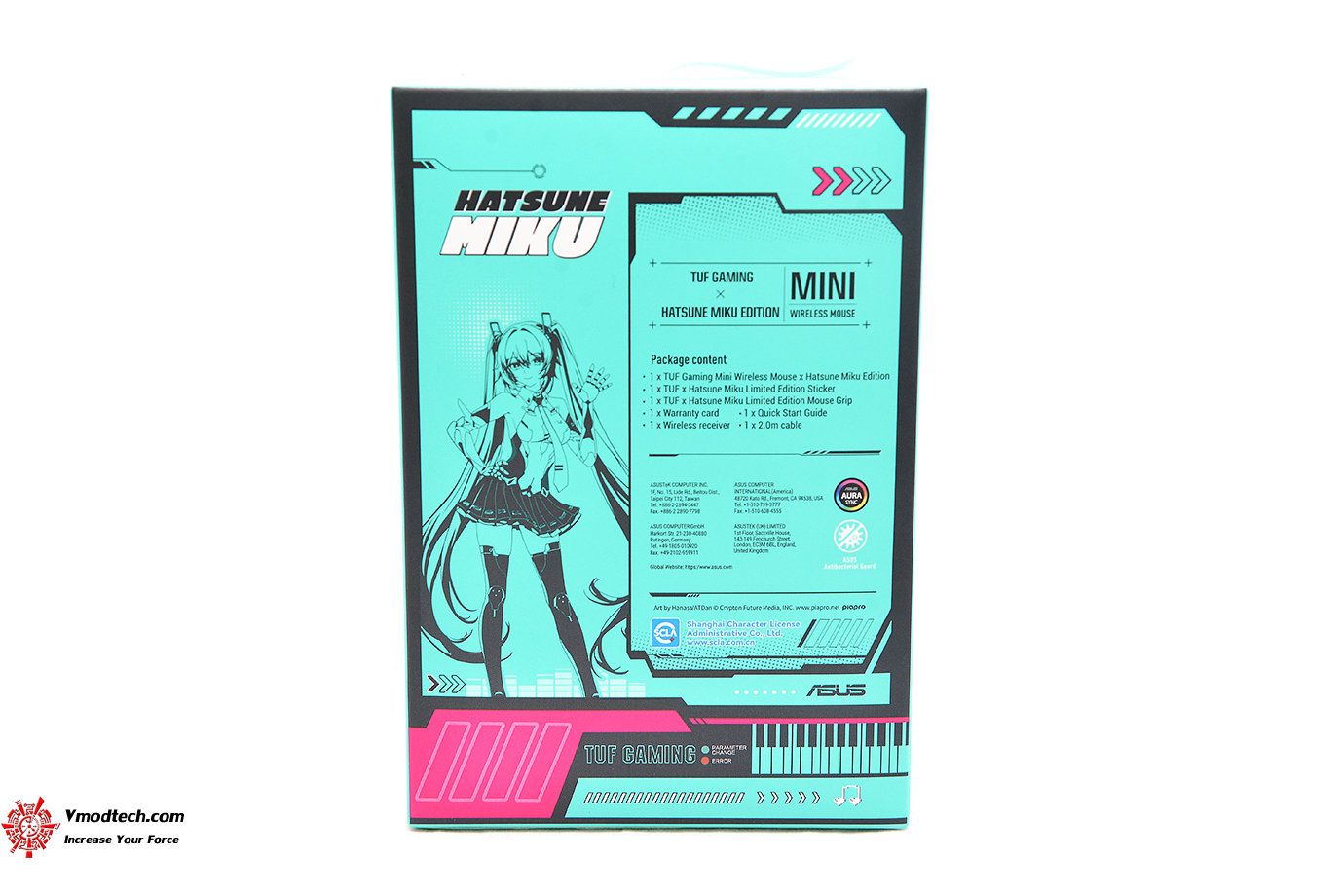 1 x TUF Gaming Mini Wireless Mouse Hatsune Miku Edition 1 x TUF Gaming Mini Wireless Mouse Hatsune Miku Edition Sticker 1 x Hatsune Miku grip tape set 1 x USB wireless receiver 1 x Quick Start Guide 1 x 2-meter Paracord 1 x Warranty booklet