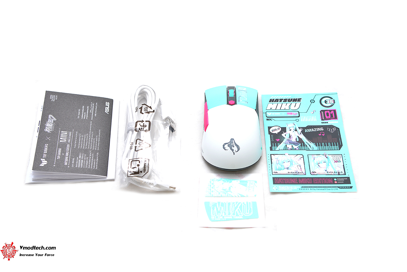 เมื่อเปิดกล่องออกมาก็จะพบคู่มือ ตัวเม้าส์ ASUS TUF GAMING Mini Wireless Mouse Hatsune Miku Edition และอุปกรณ์เสริมพิเศษของตัวเม้าส์ อาทิ