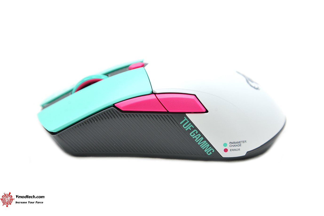 ตัวเม้า ASUS TUF GAMING Mini Wireless Mouse Hatsune Miku Edition ดีไซน์สีขาวสลับสีเขียวและชมพูกับการออกแบบที่จับได้ถนัดมือสบายมือเหมาะกับสาย FPS หรือผู้ใช้งานทั่วไป สายเอนิเมะต้องจัดเลยครับสวยงามน่ารักมากๆ