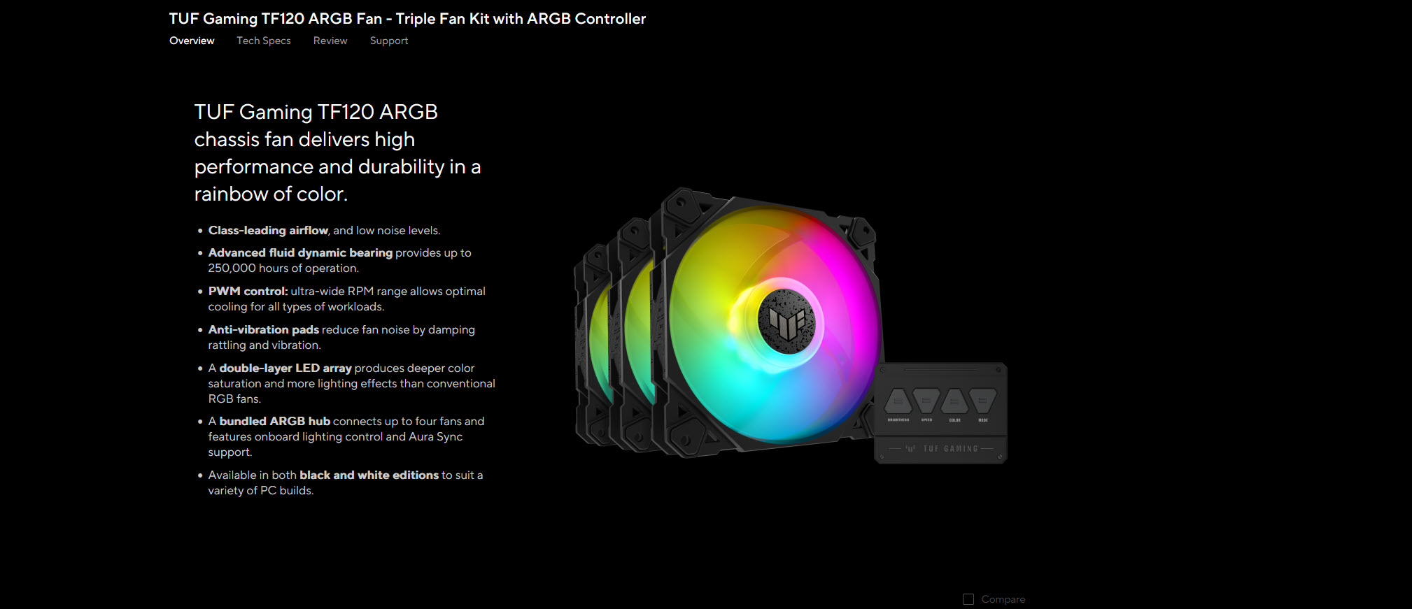 ASUS TUF GAMING TF120 ARGB รุ่นใหม่ล่าสุดมาให้ทุกท่านได้ชมกันครับกับพัดลมในซีรี่ย์ TUF ที่เน้นความทนทาน ดีไซน์สวยงามพร้อมไฟ ARGB แสดงผลอย่างสวยงามเลยครับเหมาะกับการตกแต่งเคสให้สวยงามรวมไปถึงการใช้งานที่หลากหลายและแต่จะไป DIY กันครับ โดยพัดลม ASUS TUF GAMING TF120 ARGB เป็นพัดลมขนาด 120mm มีความเร็วพัดลมสูงสุดที่ 1900RPM ส่วน Airflow อยู่ที่ 76 CFM แบบ PWM control เน้นความทนทานในการใช้งานของลุกปื่นยาวนานมากถึง 250,000 ชั่วโมงเลยครับรวมไปถึงความเงียบที่เป็นจุดเด่น เดี๋ยวเราไปชมในรีวิวกันได้เลยครับว่าจะสวยงามและน่าใช้งานมากน้อยขนาดไหน