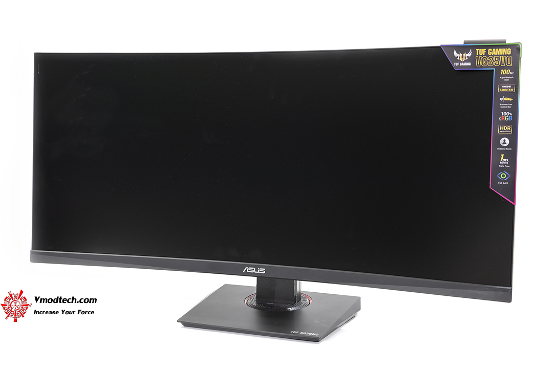 ตัวจอ TUF Gaming VG35VQ ซึ่งเป็นจอโค้งขนาด 1800R โดยตัวจอนั้นเป็นจอ LED มอนิเนอร์ที่มีความละเอียด 3440 × 1440 หรือ WQHD ตัวพาแนลเป็นแบบ VA ที่สามารถให้ความสว่างและคอนทราสที่ดี อัตราส่วนจออยู่ที่ 21:9 มีขนาด 35 นิ้ว และรีเฟรชเรทที่ 100 Hz