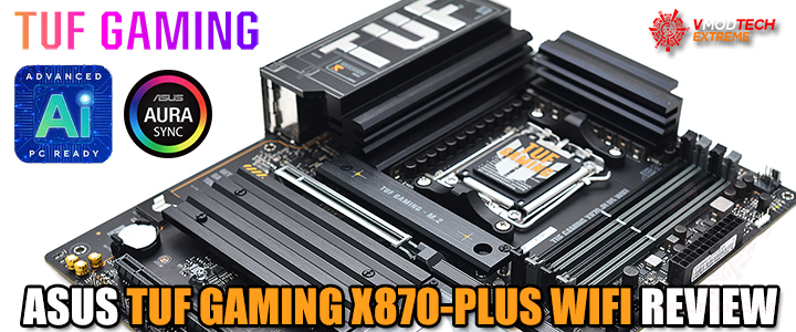 โดยฟีเจอร์การทำงานของเมนบอร์ด ASUS TUF GAMING X870-PLUS WIFI จัดเต็มด้วยฟีเจอร์มากมายไม่ว่าจะเป็นการรองรับ PCIe® 5.0, ฟีเจอร์ AI การโอเวอร์คล็อก AI Overclocking , AI Cooling II , AI Networking II และ AEMP ที่ปรับแต่งแรมด้วยการตั้งค่าแรมให้พร้อมรองรับบัสแรมประสิทธิภาพสูงสุด บรรดาพอร์ตเชื่อมต่อประกอบด้วย USB4.0 ความเร็ว 40Gbps และระบบ WiFi 7 พร้อมช่องแลนแบบ 2.5G Ethernet พร้อมทั้งการรองรับการ DIY อย่างเต็มรูปแบบทั้งการติดตั้งชุดน้ำ AIO และชุดพัดลมพร้อมไฟ RGB ได้อย่างสมบรูณ์ ในส่วนของการระบายความร้อนก็จัดเต็มด้วยฮีตซิงค์ภาคจ่ายไฟและ M.2 เย็นระบายความร้อนได้เต็มที่ทั่วทั้งเมนบอร์ดครับ โดยเมนบอร์ด ASUS TUF GAMING X870-PLUS WIFI นั้นดีไซน์ก็ยังคงเอกลักษณ์ TUF ซีรี่ย์ที่เน้นความดุดันพร้อมไฟ RGB ด้านหน้าที่พร้อมฟีเจอร์ Aura Sync ทำงานได้อย่างลงตัวสวยงาม โดยวันนี้ทดสอบกับซีพียู AMD RYZEN 9 9900X รุ่นใหญ่ให้ได้ชมกันอย่างเต็มรูปแบบครับ