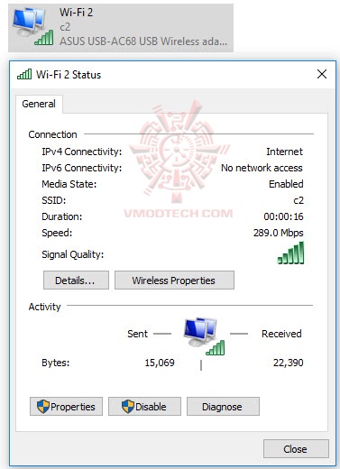 เมื่อสลับมาเชื่อมต่อกับเราเตอร์ที่ย่าน 2.4 GHz นั้น สามารถเชื่อมต่อได้ที่ความเร็ว 289 Mbps