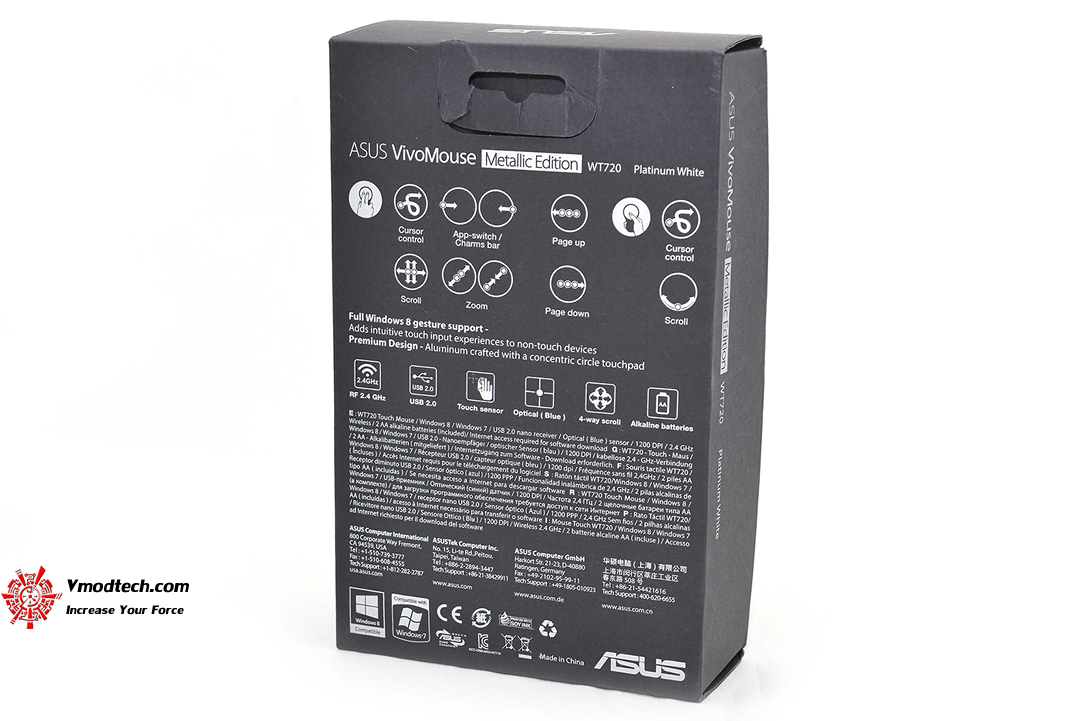 รายละเอียดของ ASUS VivoMouse Metallic Edition ด้านหลังกล่องครับ