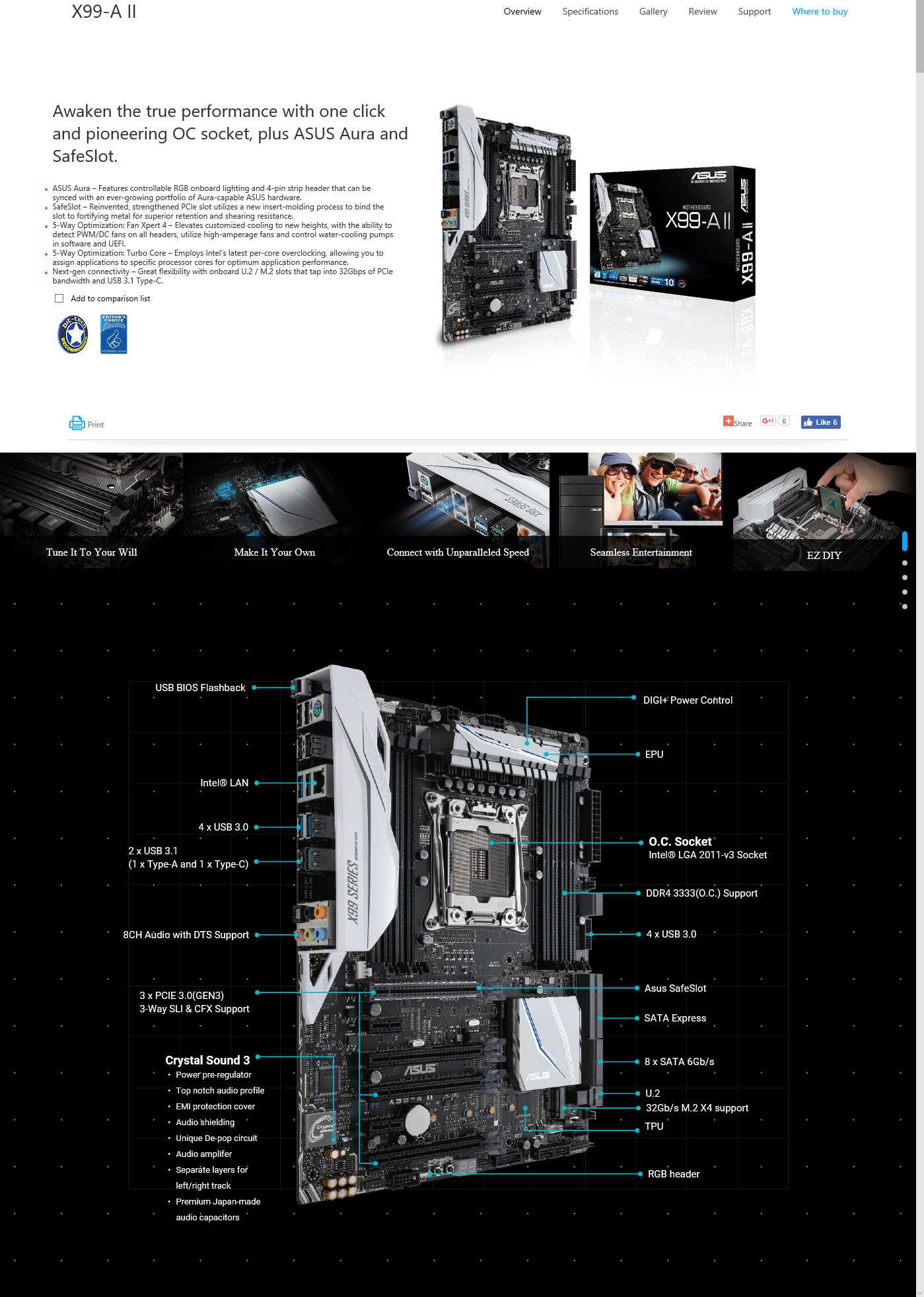 สวัสดีครับ พบกับรีวิวมาเธอร์บอร์ดตระกูลใหญ่ของอินเทลจากแบรนด์ ASUS กันอีกซักบอร์ดครับ จากครั้งก่อนเราได้พูดถึง ASUS ROG RAMPAGE V EDITION 10 และ ASUS X99 DELUXE-II กันไปแล้ว วันนี้ถึงคิวน้องเล็กครับ ASUS X99-A II ครับ ตัวบอร์ดนั้นได้รับการปรับปรุงและเพิ่มเติมฟังก์ชั่น LED ตามสมัยนิยมมาให้และก็รองรับ CPU รุ่นใหม่ของอินเทล Broadwell-E บนพื้นฐาน Socket LGA 2011-3 นั่นเอง เรามาชมรายละเอียดทั่วๆไปจากหน้าเว็บไซด์ ASUS กันเลย