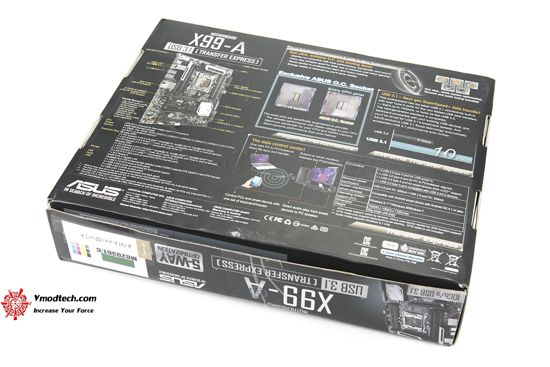 ด้านหลังกล่องนั้นก็ได้มีการแจงรายละเอียดของบอร์ดรวมถึงรายละเอียดในจุดต่างๆบนเลย์เอาท์ไว้ด้วยอย่างละเอียด โดยเฉพาะอย่างยิ่งจุดชูโรงอย่าง ASUS O.C. Socket ที่ทางเอซุสบอกไว้ว่ามันได้ถูกเพิ่มพินเข้าไปช่วยให้คุณสามารถโอเวอร์คล๊อก Uncore ไปได้มากกว่าซ๊อกเก็ตแบบมาตรฐาน