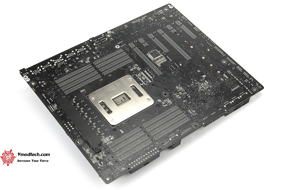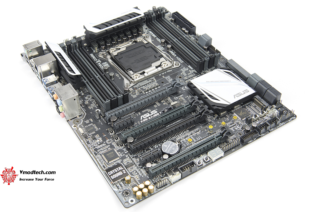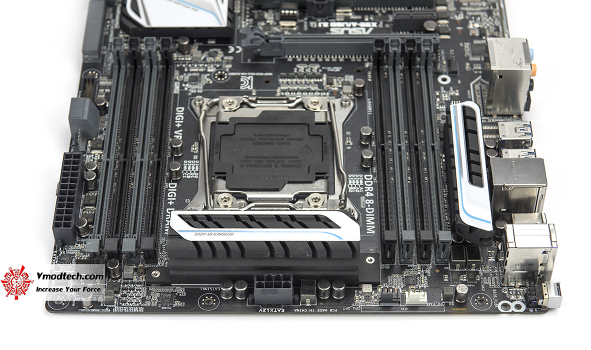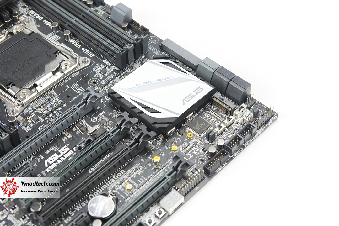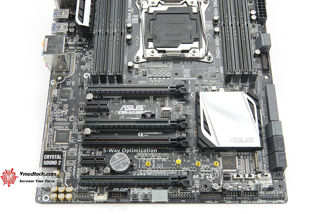 บริเวณ Socket PCI Express เจนสามมีมาให้ 6 ช่อง โดยจะเป็น x16 gen3 ทั้งหมด 4 ช่องและ X1 2 ช่อง โดยที่ช่อง M.2 นั้นจะถูกโยกไปอยู่บริเวณด้านล่างของ Sink PCH สำหรับความเร็วในการส่งผ่านอินเตอร์เฟส PCIe นั้นก็จะขึ้นอยู่กับ CPU ครับ โดยหากใส่ 5390K หรือ 5960X เข้าไปนั้น เมื่อใช้งานกราฟฟิกการ์ดสองตัวจะวิ่ง 16+16 สามใบจะวิ่ง 16+16+8 ส่วนถ้าเป็น 28 เลนอยาง 5820K ก็จะวิ่งที่ 16X, 16+8X, 16+8+4X โดยจะต่อได้ทั้งหมด 3-Way