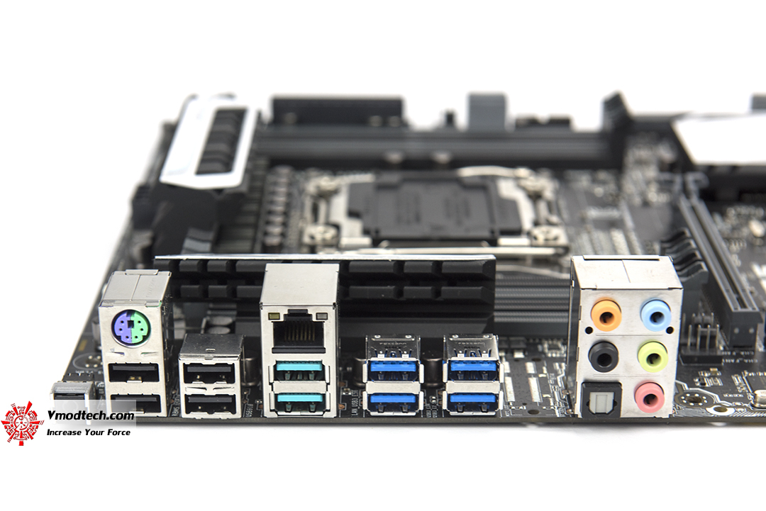 Back Panel ครับ ช่อง USB สีเขียวอ่อนจะเป็นช่อง USB 3.1 type A ที่สามารถรองรับการเชื่อมต่อทั้ง 2.0 3.0 และ 3.1 ช่อง USB 3.0 4 ช่องสีฟน้ำเงิน และ USB 2.0 4 ช่องรวมกันระหว่าง X99 และ ASMedia, gigabit lan 1 ช่อง ปุ่มเคลียร์ Bios ส่วนด้านขวามือจะเป็นส่วนของ ภาคเสียงทั้งหมด
