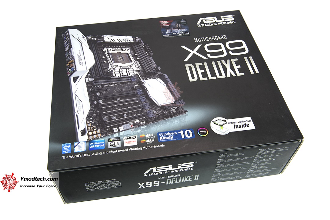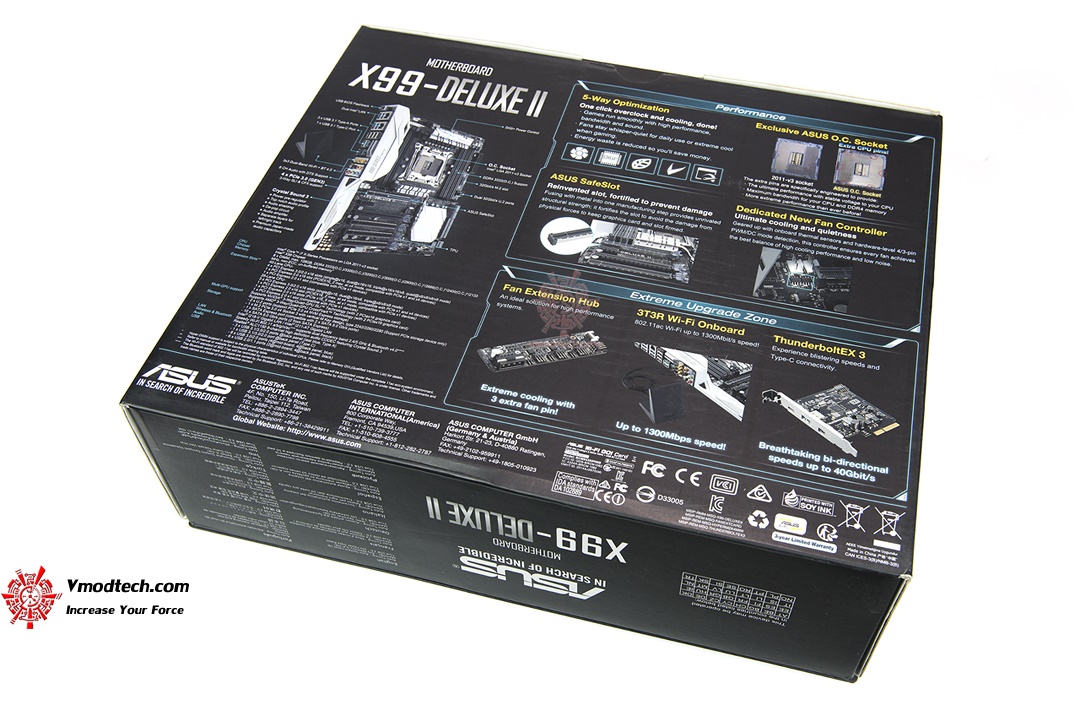 กล่องบรรจุ ASUS X99 DELUXE-II นั้นจะมีขนาดค่อนข้างใหญ่ครับ ด้านหล้าและด้านหลังกล่องมีการนำเสนอรายละเอียดของบอร์ดเอาไว้ค่อนข้างเยอะ
