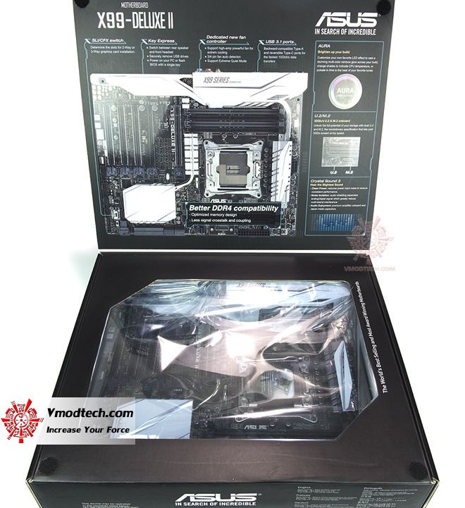 ฝาข้างกล่องนั้นสามารถเปิดขึ้นมาได้ครับ โดยที่ฝานั้นจะมีรายละเอียดแต่ละจุดที่เด่นๆของบอร์ด ASUS X99 DELUXE-II นำเสนอไว้ด้วย