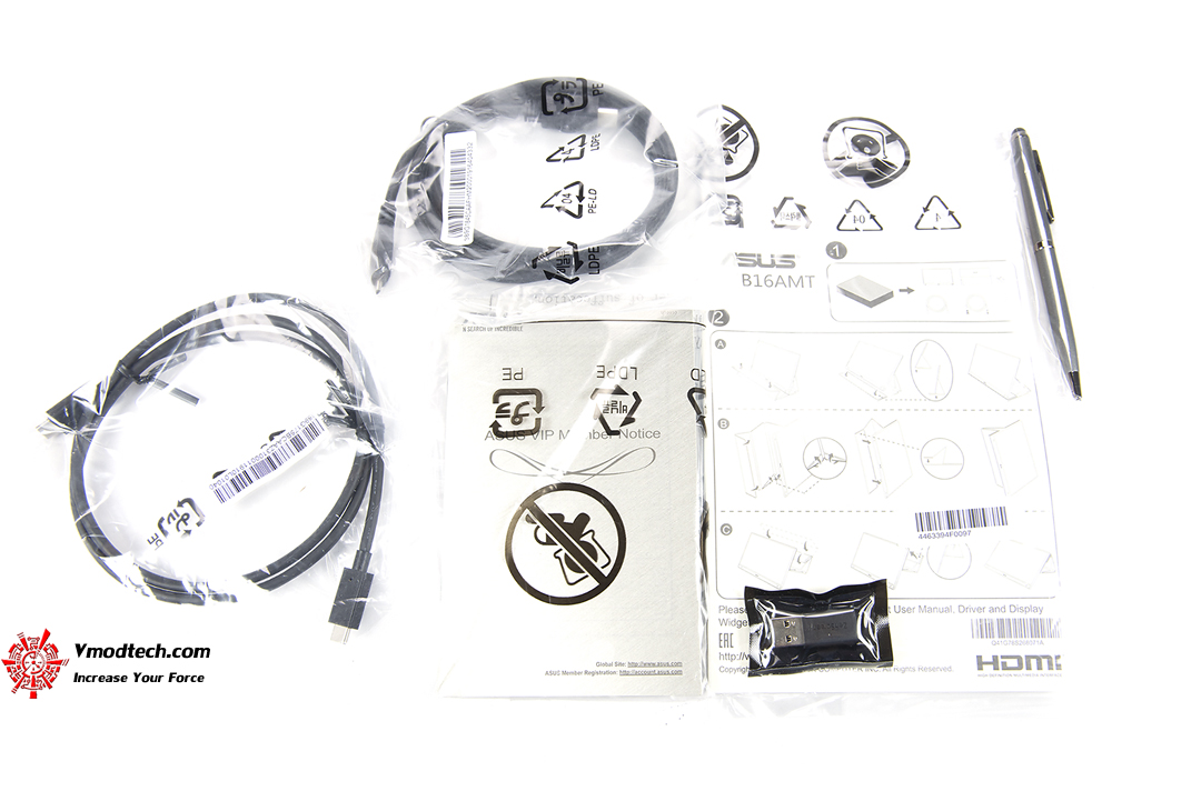 คู่มือการติดตั้งและบรรดาสายต่างๆ ASUS ที่มากับเซตนี้ซึ่งจะมีสาย USB Type-C สองหัว สาย USB Type-C เป็น micro-HDMI หัวแปลง USB Type-A เป็น USB Type-C และปากกาที่ทำหน้าที่เป็นขาตั้งของจอด้วย