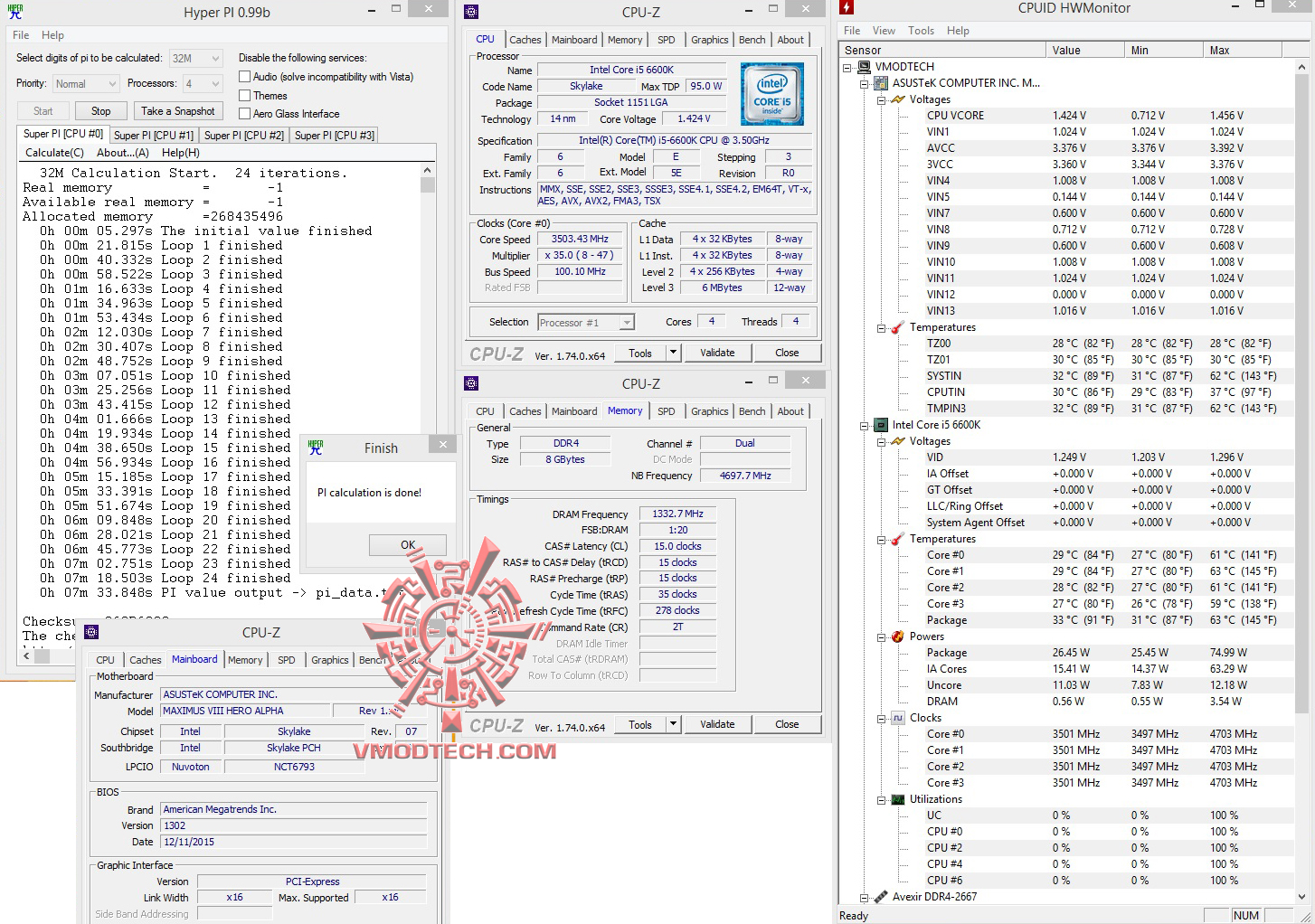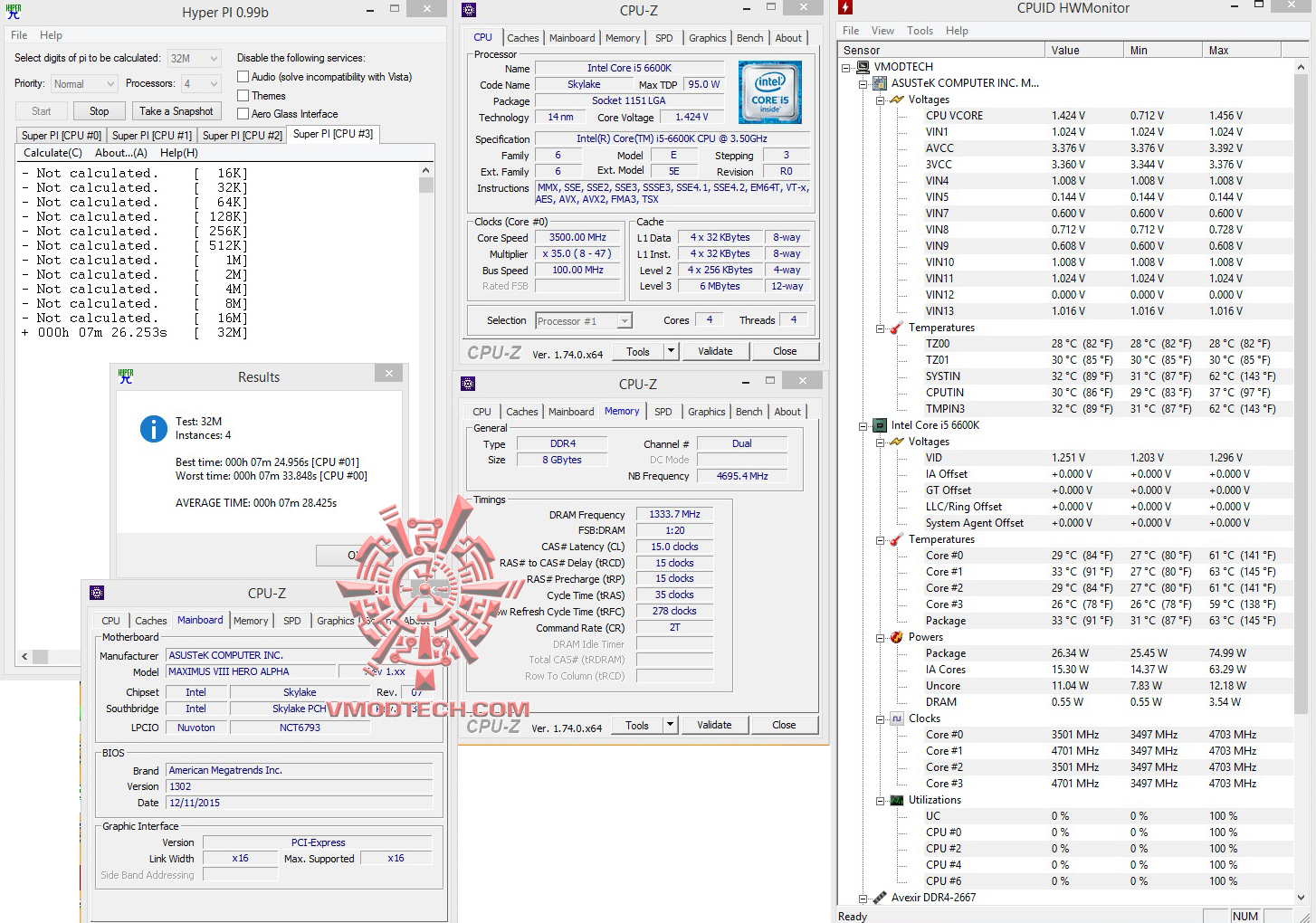 สำหรับชุด ทดสอบ SuperPI1MB จบไปที่ 7.767วินาที , 32MB จบไป6นาที 49.339นาที แรงดีเลยครับ ส่วน HyperPI32MB ก็ผ่านหมดอยู่ที่ 7นาทีต้นๆครับ ถือว่าแรงดีมากครับกับบัสแรมเดิมเพียง 2666Mhz ความจุ 8GB ทำผลงานได้ไม่เลวเลยครับ