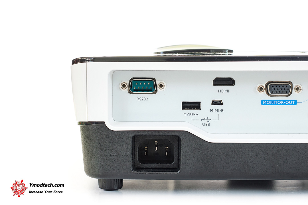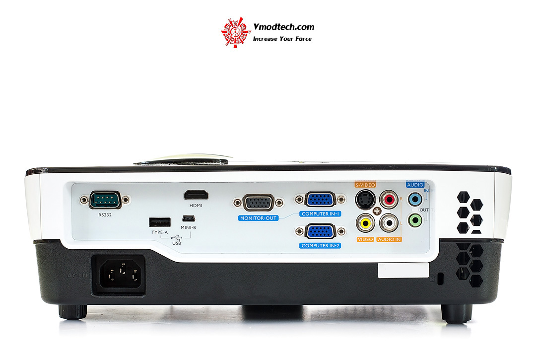 ด้านหลังซ้ายมือมีช่องเสียบสายไฟ Input AC100 to 240 V - 50 to 60 Hz, ช่องเสียบ RS232 (DB-9pin), USB.2.0, USB MINI, HDMI, Monitor out (D-sub 15pin)