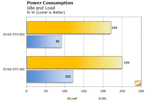 เราตัดสินใจที่จะเปรียบเทียบอัตราการใช้พลังงานระหว่างสองการ์ดในสถานะไอเดิล และฟูลโหลด โดยทำการเปรียบเทียบขณะรันเกมส์ Shogun 2 ที่ปรับแต่งรายละเอียดที่ High Details, ความแตกต่างของอัตราการใช้งานที่ 30 วัตต์ระหว่างสองการ์ดนั้นเป็นผลที่น่าสนใจมาก นี่แค่เพียงเราเปลี่ยนอุปกรณ์แค่หนึ่งชิ้นเท่านั้น อะไรเป็นจุดที่น่าสนใจบ้าง ประสิทธิภาพของการใช้พลังงานเมื่อวัดจากเฟรมต่อวัตต์ การ์ด GTX 260 เมื่อประกอบเข้ากับจุดทดสอบใช้พลังงาน 250 วัตต์ มันสามารถปั่นเฟรมเรทออกมาได้ที่ 30 เฟรมต่อวินาที แต่กับ EVGA GTX 660 กับชุดทดสอบเดียวกันสามารถรีดเฟรมเรทออกมาได้มากกว่าเกือบๆเท่าตัวคือประมาณ 63 เฟรมต่อวินาทีในขณะที่ระบบกินไฟน้อยกว่าถึง 12 เปอร์เซนต์ รวมถึงการ์ดนั้นมีแรมและจำนวนทรานซิสเตอร์มากกว่าเกือบสองเท่าถ้าพูดกันคร่าวๆ