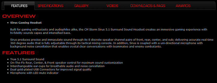 Introduction main . สวัสดีครับ วันนี้มี Gaming Headset จากค่าย CM Storm ซึ่งเป็นบริษัทลูกของ Coolermaster นั่นเองครับ โดยที่วันนี้จะมาแนะนำ CM STORM SIRUS ซึ่งเป็นหูฟัง 5.1 Channel แท้ๆอีกหนึ่งรุ่นของวงการ เรามาชมรายละเอียดจากหน้าเว็บของ CM Storm กันก่อนว่า SIRUS นั้นจะมีรายละเอียดอย่างไรบ้าง . CM Strom Sirus Webpage