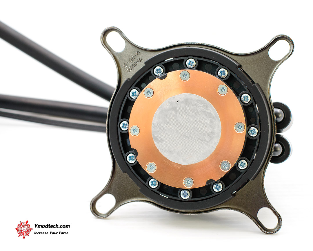 ตัวบล็อคกับตัวปั๊มก็ออกแบบมาให้รวมอยู่ในตัวเดียวกันตามที่ได้เห็นกันทั่วๆไปของชุดน้ำสำเร็จรูปนะครับ ส่วนขาล็อคซ็อคเก็ต Intel ที่เห็นเงาๆมีรู 4 รูนั้น ถูกติดตั้งมาจากโรงงานแกะกล่องก็เจอแบบนี้เลย ผมก็ถือโอกาสไม่ถอดออกมานะครับเพราะเดี๋ยวจะใช้กับ i7-3770K ตัวเก่งซะเลย