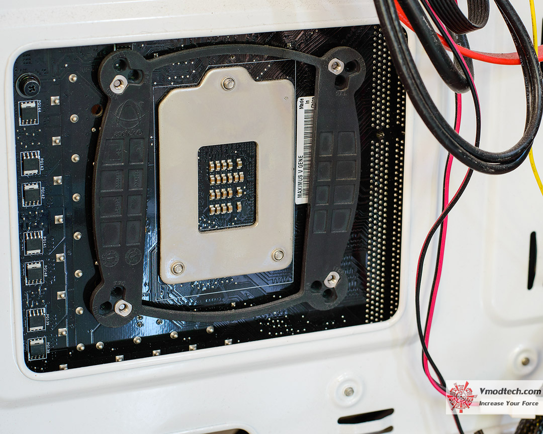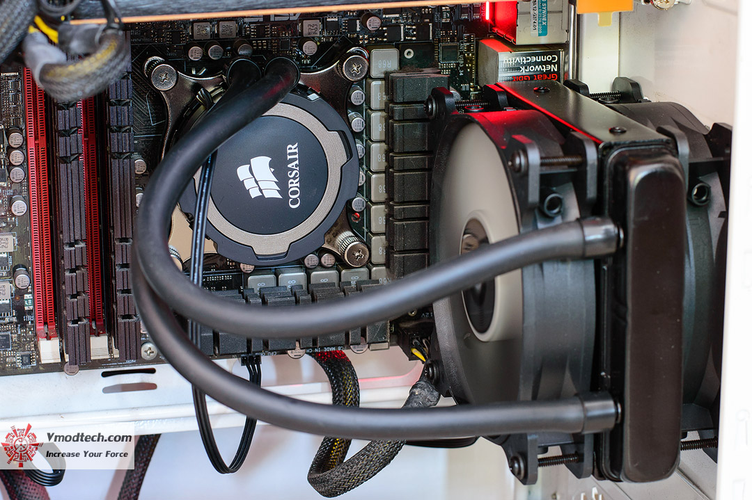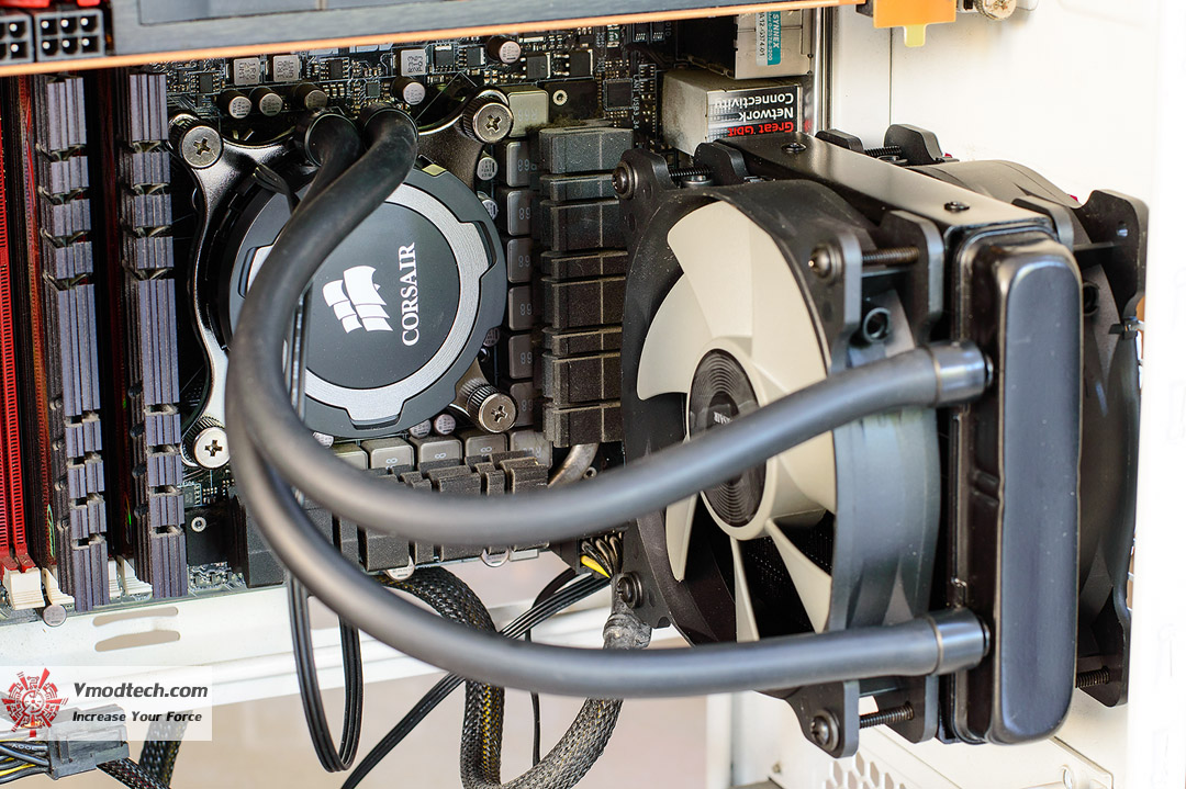 ทำการยึดพัดลมและหม้อน้ำให้เข้าที่เข้าทาง และต่อสายไฟต่างๆให้เรียบร้อย หม้อน้ำบางๆแบบนี้ไม่กินพื้นที่เกะกะมากครับ สายท่อน้ำก็อ่อนประกอบง่ายไม่รั้งมือ อย่างนี้ยกนิ้วให้เลยครับ