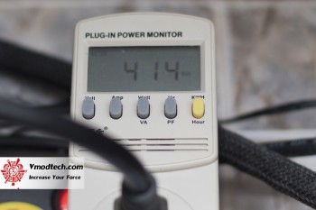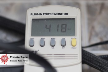 และเมื่อตรวจสอบกำลังไฟที่ระบบเรียกจากเต้ารับนั้นจะเห็นว่าพุ่งไปมาแถวๆเกือบๆ 420 วัตต์เท่านั้นครับแทบไม่ต่างจากตอนปกติเลย ตรงนี้นิดนึงครับ เมื่อไม่มีโหลดนั้น พัดลมจะหยุดหมุน