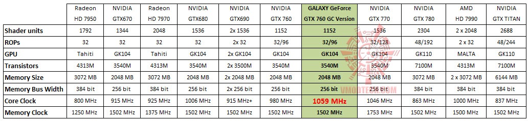 จากตารางจะเห็นความแตกต่างระหว่าง NVIDIA GeForce GTX 760 กับ GALAXY GeForce GTX 760 GC 2GB Version ได้เป็นอย่างดีในส่วนของคอร์ที่ทาง GALAXY ได้ทำการโอเวอร์คล๊อกมาเล็กน้อย