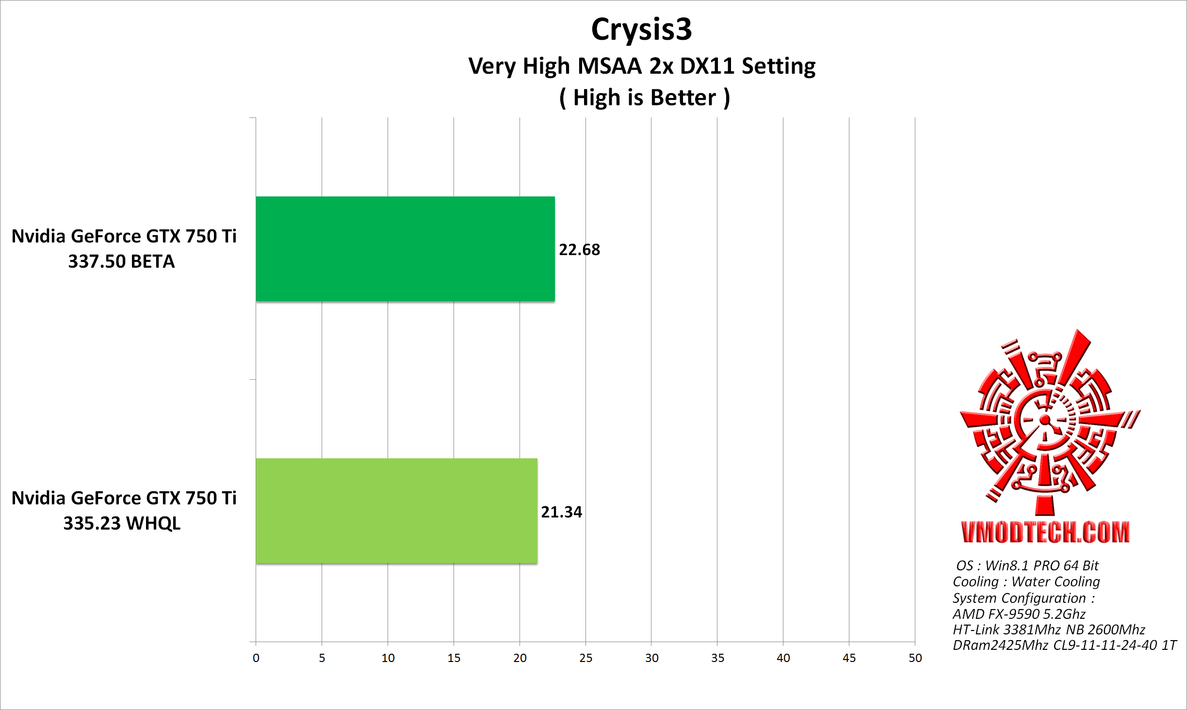 Crysis3 ในระดับ Very High 2X MSAA ทำเฟรมเรตสูงขึ้นกว่าเดิมครับ โดยเฉพาะเฟรมเรตสูงสุด ก็ยังคงแรงขึ้นครับแม้ว่าไม่ไช่เกมส์ที่ทาง Nvidia ได้กำหนดเอาไว้