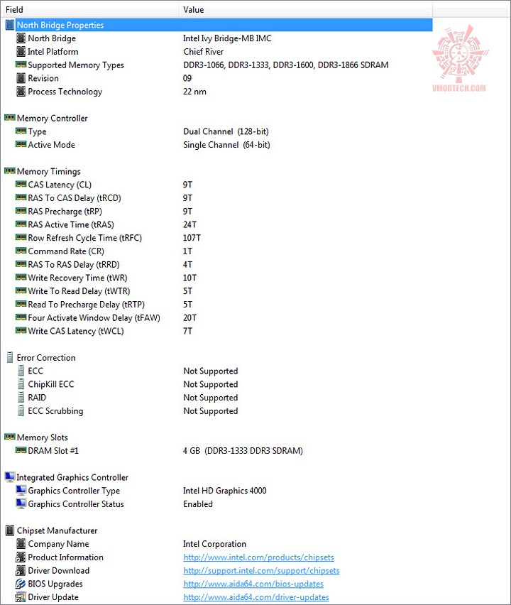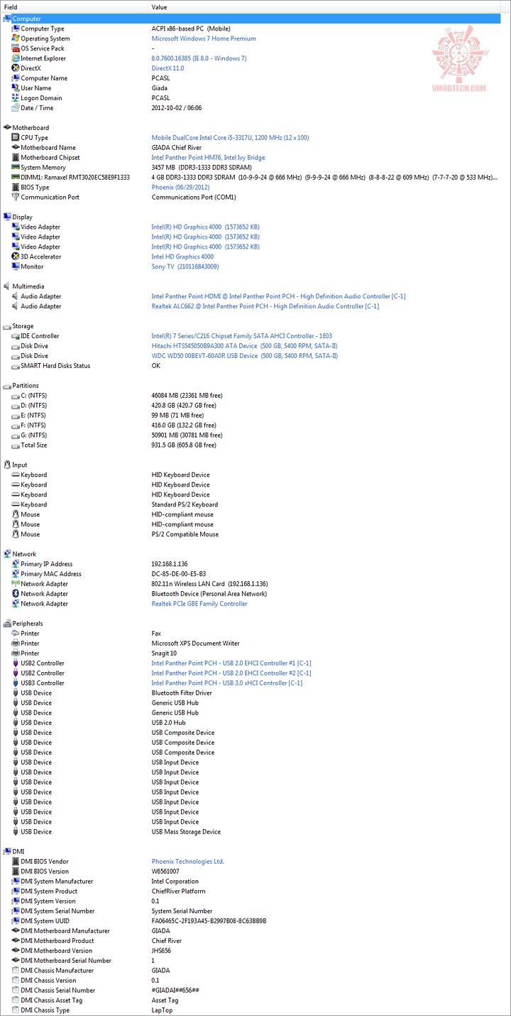 จากที่อ่านสเปกจาก AIDA นะครับ จะเห็นได้ว่าตัว Giada Mini PC i53 นั้นใช้ CPU Core Generation 3 Ivy Bridge แบบ Mobile รุ่น Core i5-3317U พกแรมมาสี่กิ๊กกาไบท์ ชิพเซ็ตจะเป็น HM76 ครับ
