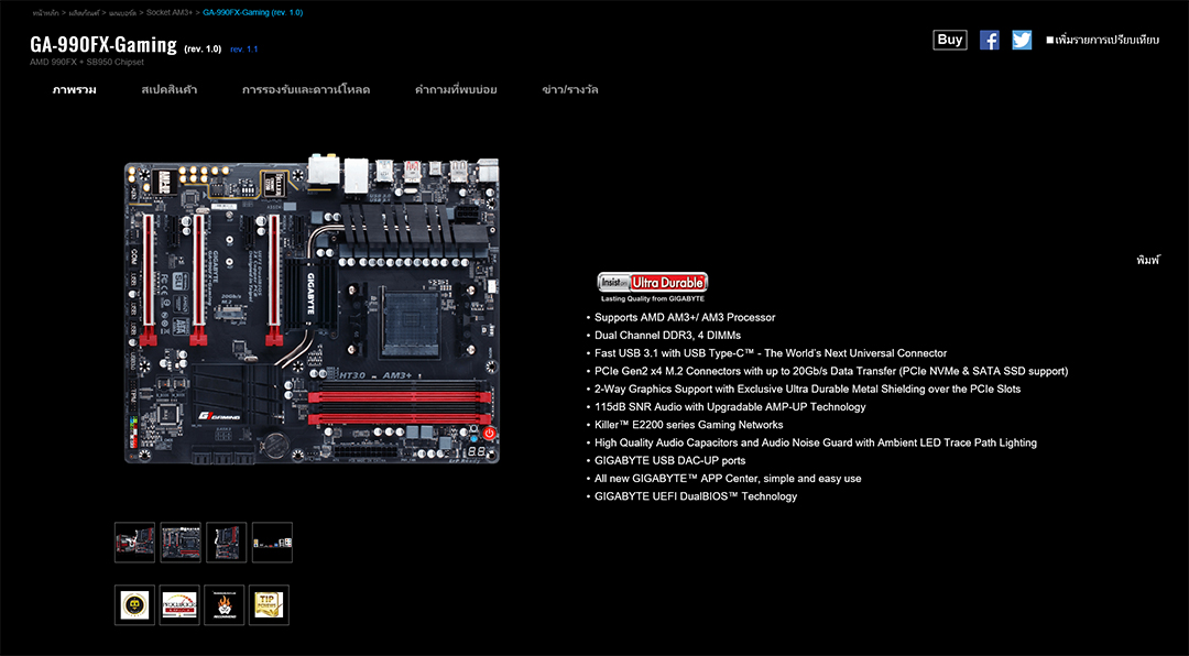 GIGABYTE 990FX-GAMING เป็นรุ่นเกมส์มิ่ง G1 Gaming ที่ออกมาเน้นฟีเจอร์สำคัญๆเพื่อคอเกมส์มิ่งโดยเฉพาะครับ ไม่ว่าจะเป็น Killer E2200 , 115dB SNR Audio , PCIe Gen2 x4 M.2 , USB Type-C , Ultra Durable Metal Shielding ซึ่งก็เป็นการอัพเกรดวัสดุรวมไปถึงฟีเจอร์ใหม่ๆลงในแพลตฟอร์มเมนบอร์ด AMD นั่นเองครับ ในส่วนของดีไซน์นั้นก็จะแตกต่างจากรุ่น Ultra Durable Series ที่เป็น AM3+ ที่ผ่านมาครับ โดยเน้นโทนสีดำสลับแดงมี PCIe ที่เป็น Ultra Durable Metal Shielding ไว้ป้องกันอันตรายในการติดตั้งการ์ดจอและส่งสัญญาณได้ดียิ่งขึ้นมากกว่าเดิมทั้งหมดทุกสล๊อต PCIe อีกด้วยครับ ส่วนประสิทธิภาพการทำงานเป็นเช่นไรนั้นเดี๋ยวเราไปชมได้ในบททดสอบครับ