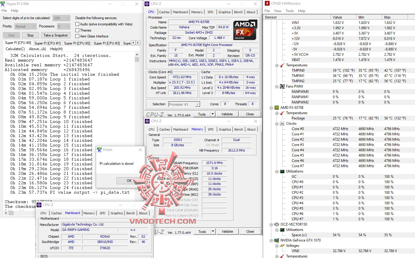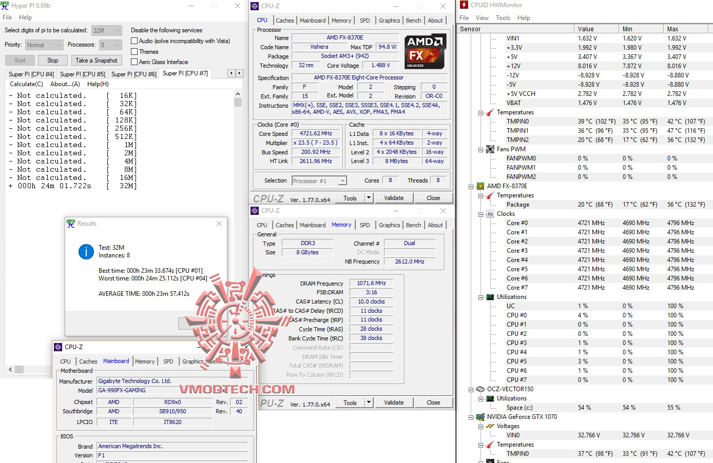 สำหรับชุด ทดสอบ SuperPI1MB จบไปที่ 19.312วินาที , 32MB จบไป 19นาที 58.333 วินาที ส่วน HyperPI 32MB ก็ผ่านหมดแรงแบบนิ่งๆใช้งานกันได้จริงอย่างมีเสถียรภาพครับ เฉลี่ยราวๆ 24 นาทีกว่าๆ ทั้ง 8เทรด ทำได้ดีตามมาตรฐานความเร็ว 4.7Ghz ครับ