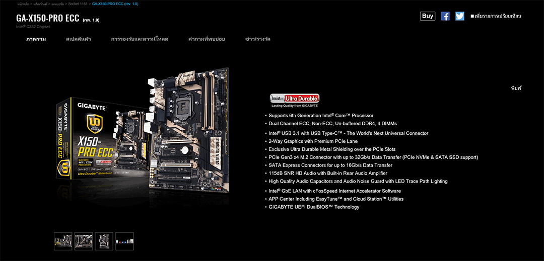 GIGABYTE GA-X150-PRO ECC ซึ่งเป็นแบรนด์ดังอีกแบรนด์ที่เรารู้จักกันดีครับ สำหรับฟีเจอร์การทำงานนั้นก็ไม่ธรรมดาครับเป็นการออกแบบมาให้เหมาะสมกับงานระดับมืออาชีพในงาน Workstation กับสีสรรเมนบอร์ดที่มาในลายพรางสีน้ำตาลสวยงามโดดเด่นเลยครับพร้อมด้วยมาตรฐาน Ultra Durable ที่มีทั้งความทนทานกับการใช้งานที่เน้นประสิทธิภาพที่พร้อมรองรับอุปกรณ์ Workstation แรงๆได้อย่างสมบรณ์กันเลยทีเดียวครับ ในส่วนของฟีเจอร์หลักๆของเมนบอร์ด GIGABYTE GA-X150-PRO ECC รุ่นนี้ก็คือ แรมที่รองรับการทำงานทั้ง ECC, Non-ECC ครับ รวมไปถึง USB 3.1 with USB Type-C , PCIe Gen3 x4 M.2 , Metal Shielding , 115dB SNR HD Audio , Intel GbE LAN เรียกได้ว่าฟีเจอร์ที่มีความสำคัญๆนั้นให้มากันครบครันเลยครับ ส่วนประสิทธิภาพการทำงานจะเป็นเช่นไรนั้น เดี๋ยวเราไปชมในรีวิวกันได้เลยครับ