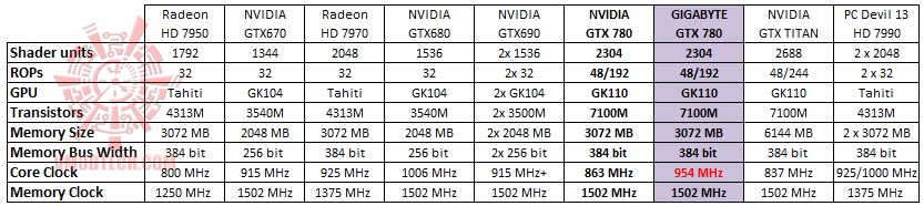 จากตารางจะเห็นความแตกต่างระหว่าง NVIDIA GeForce GTX 780 กับ GIGABYTE GeForce GTX 780 WINDFORCE 3X ได้เป็นอย่างดีในส่วนของคอร์ที่ทาง GIGABYTE ได้ทำการโอเวอร์คล๊อกมาแล้ว