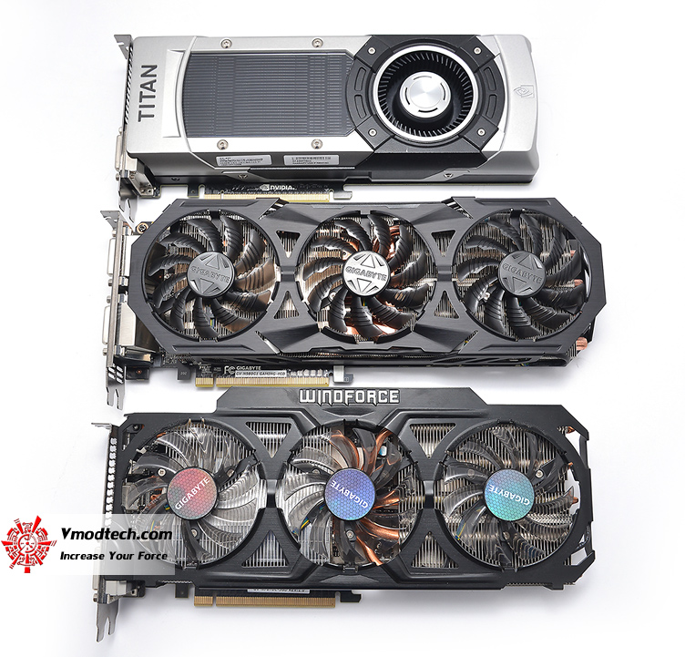 ภาพด้านบนเป็นการเปรียบเทียบขนาดของการ์ดกิ๊กกาไบท์ 780 Ti ซิ้งรุ่นก่อนตัวล่างสุดกับ 980 G1 GAMING ตัวกลาง และด้านบนสุดจะเป็น TITAN BLACK ที่เป็นฮีทซิ้งมาตรฐานจากโรงงาน จะเห็นได้ว่า ตัวซิ้งค์ใหม่นั้นมีขนาดความกว้างและพื้นที่เล็กลง แต่น้ำหนักที่ยกขึ้นมานั้น รู้เลยครับว่าหนักกว่าที่ชั่งด้วยตาเยอะเลย