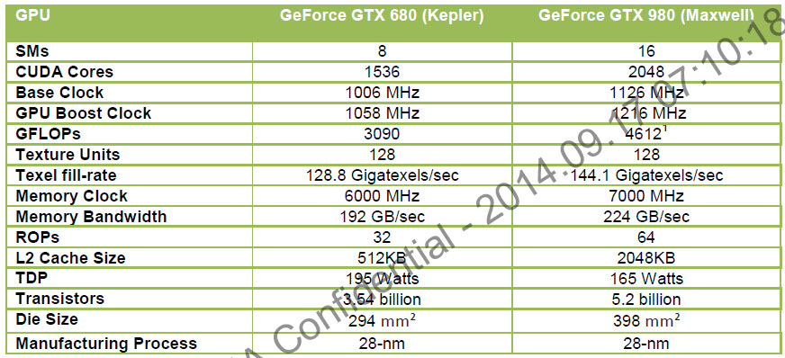 จากตาราง เปรียบเทียบรายละเอียดระดับสูงด้านบนนั้นจะแสดงให้เห็นความแตกต่างระหว่า โครงสร้าง Kepler บน GeForce GTX 680 กับ Maxwell GeForce GTX 980 ซึ่ง 980 นั้นมี SMs มากกว่าถึงสองเท่า ซึ่งเนื่องมาจากการรวมเอา SMs สองหน่วยรวมเข้าไปโดยที่ไม่ได้ทำการดับบลิ่งในได และ SM แต่ละหน่วยนั้นจะทำงานให้กับ PolyMorph Engine แบบเอกเทศด้วย GeForce GTX 980 นั้นมียูนิตในการคำนวนด้านเลขาคณิตมากกว่าเท่าตัว