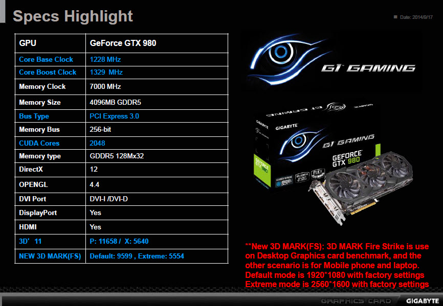 ความเร็วมาตรฐานของ GIGABYTE GeForce GTX 980 G1 GAMING 4GB นั้นคือ 1228/1753/1329 MHz Core/Mem ซึ่งเป็นความเร็วที่ได้ทำการโอเวอร์คล๊อกขึ้นมาจากความเร็วมาตรฐานของการ์ดจากโรงงานที่ประมาณ 9%