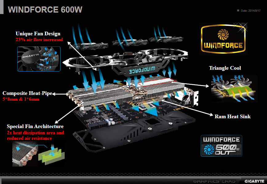 และจะไม่พูดถึงไม่ได้เลยก็คือชุดระบายความร้อน WINFORCE 600W รุ่นล่าสุดของทาง GIGABYTE มันช่วยควบคุมอุณหภูมิของ GPU ได้ดีมากครับ ความดังของเสียงพัดลมก็ไม่มาก เรียกว่าเบากว่าการ์ด Ref เยอะเลย จุดนี้จะเป็นผลดีต่อนักเล่นเกมส์บางคนที่อาจจะวางคอมพิวเตอร์ของเราไว้ใน ห้องนอนเหมือนกับผม เมื่อเล่นเกมส์นั้น อย่างที่ทราบกัน GPU จะทำงานเต็มที่และต่อเนื่องทำให้ระบบควบคุมความร้อนสั่งให้พัดลมทำงานเต็ม ที่ หากเป็นการ์ดที่ไม่ได้ออกแบบมาเป็นอย่างดีแล้ว พัดลมจะให้เสียงที่ดังจนน่ารำคาญเลย รวมถึงดีไซน์การออกแบบที่ผมมองว่าสวยงามมากและเป็นเอกลักษณ์ของ GIGABYTE มาช้านาน คิดว่าเมื่อเปิดตัวจริงๆและวางขาย น่าจะเป็นอีกรุ่นนึงที่ได้รับความนิยมครับ หากใครกำลังเตรียมงบไว้และถูกใจการออกแบบและประสิทธิภาพแล้วละก็ รอเลยครับ