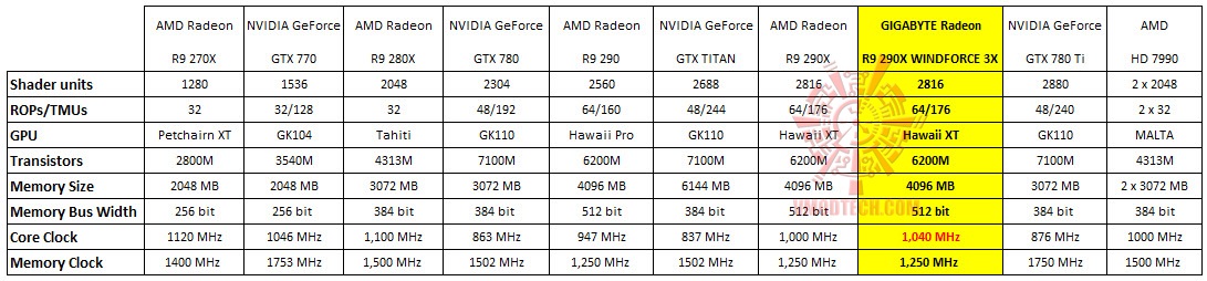 ตารางเปรียบเทียบระหว่าง GIGABYTE Radeon R9 290X WINDFORCE 3X กับรุ่นที่ใกล้เคียง